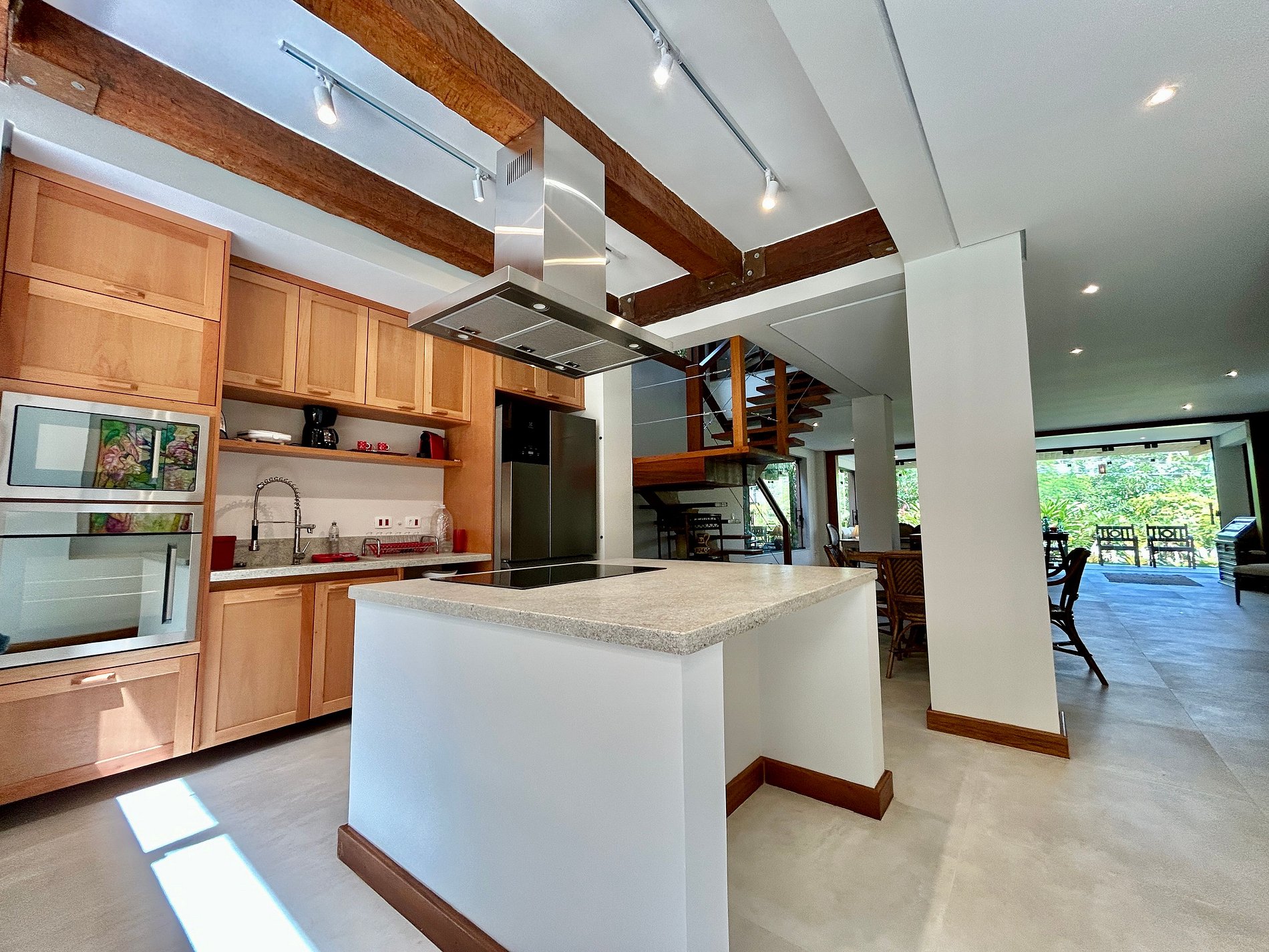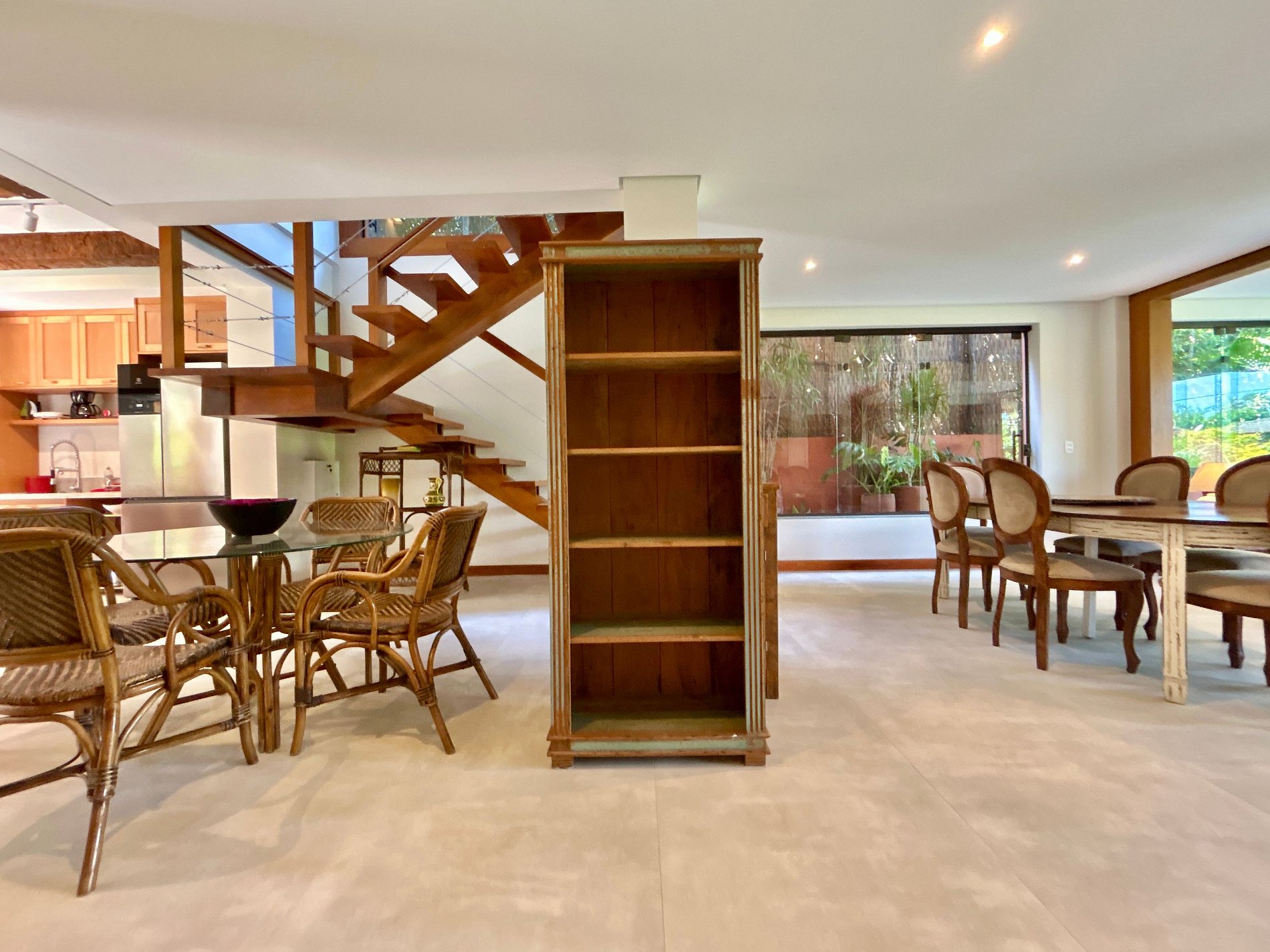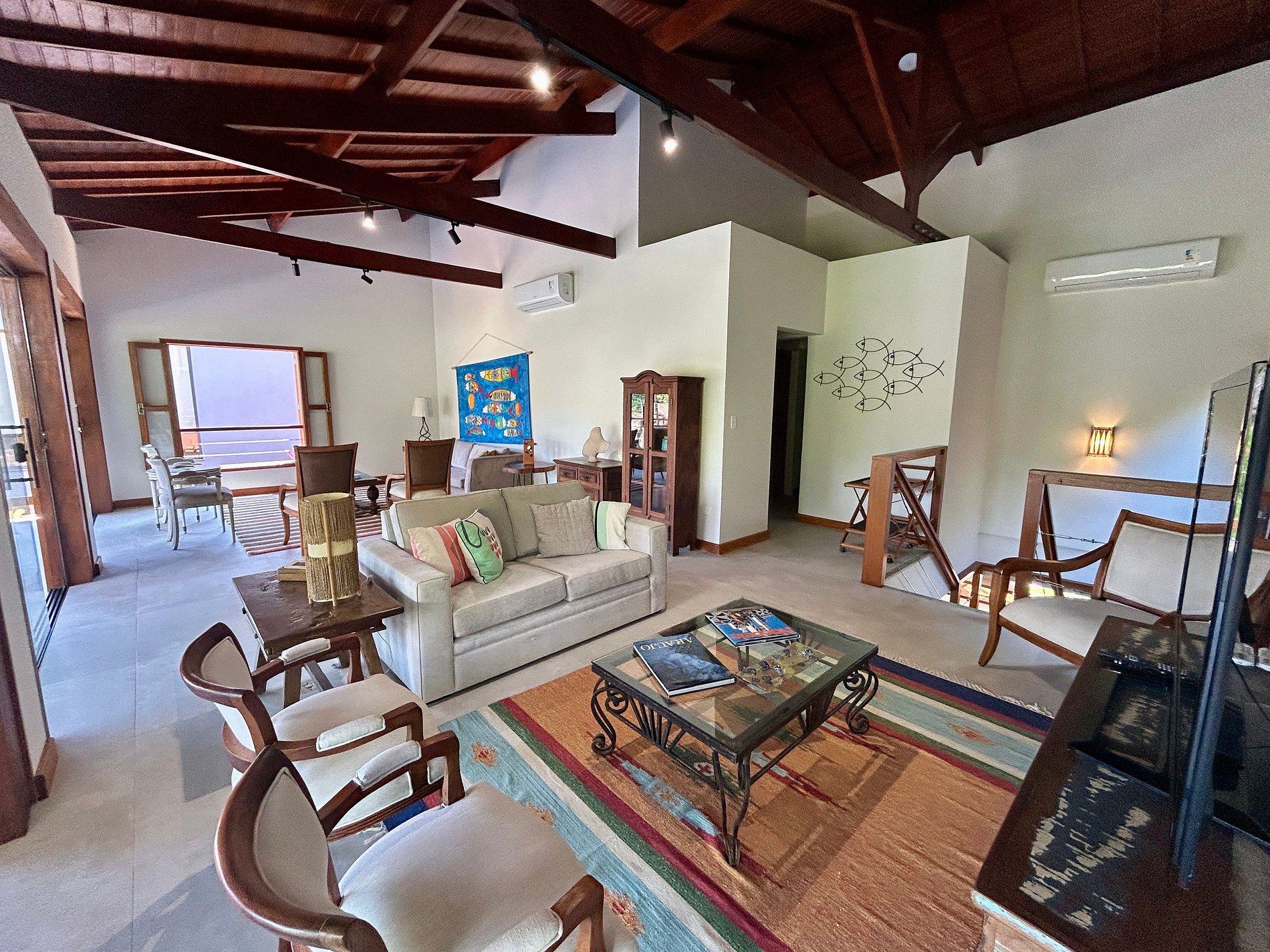 - A área social interna é acolhedora, agradável e com uma decoração de muito bom gosto. No térreo há um lavabo, salas de estar, jantar, varanda e cozinha moderna, em ambiente integrado. No andar superior, uma ampla sala de TV e estar, integradas à uma varanda com deck de madeira e mesa para refeições ao ar livre;