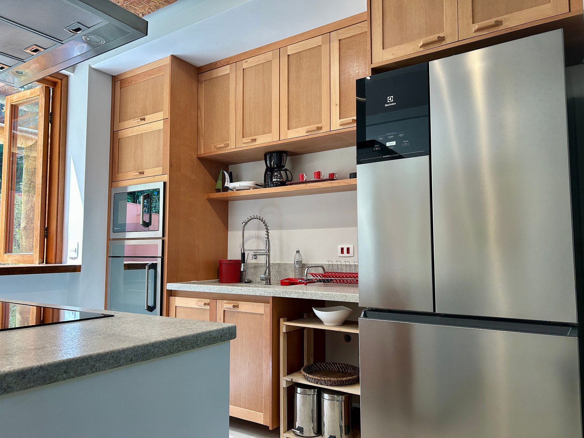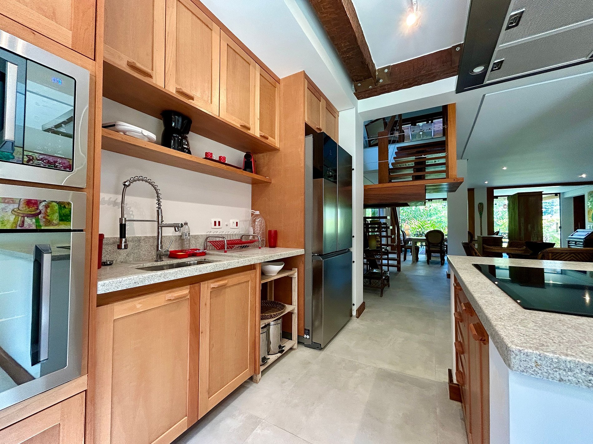- Cozinha completa, com cristaleira com diversos copos e taças, fogão, forno elétrico, micro-ondas, geladeira side by side com freezer, cafeteira Nespresso, cafeteira com filtro, filtro de água, liquidificador, mixer, espremedor de laranja, sanduicheira, louças, talheres e demais utensílios para uma estadia perfeita;