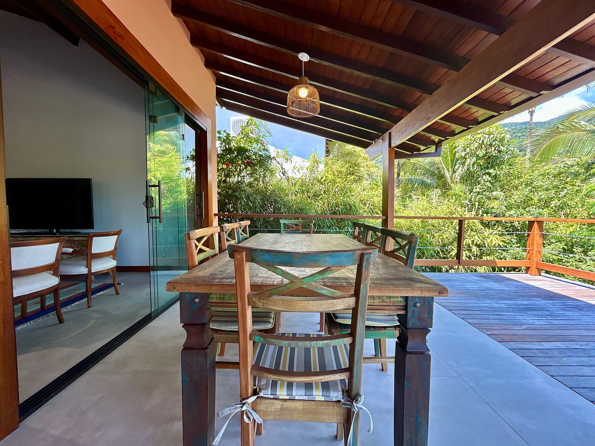 Sala de TV no pavimento superior com varanda e deck voltado para a natureza