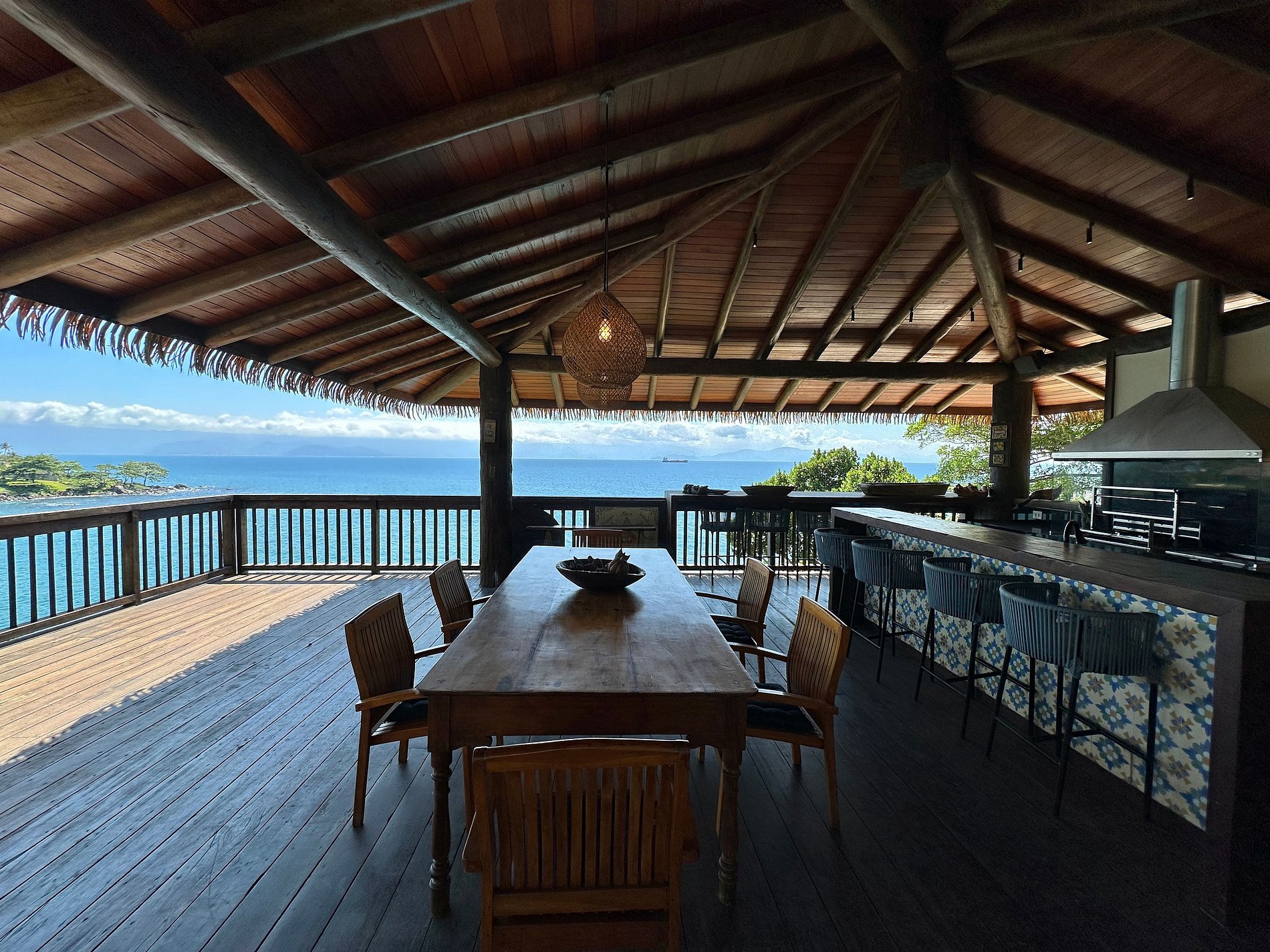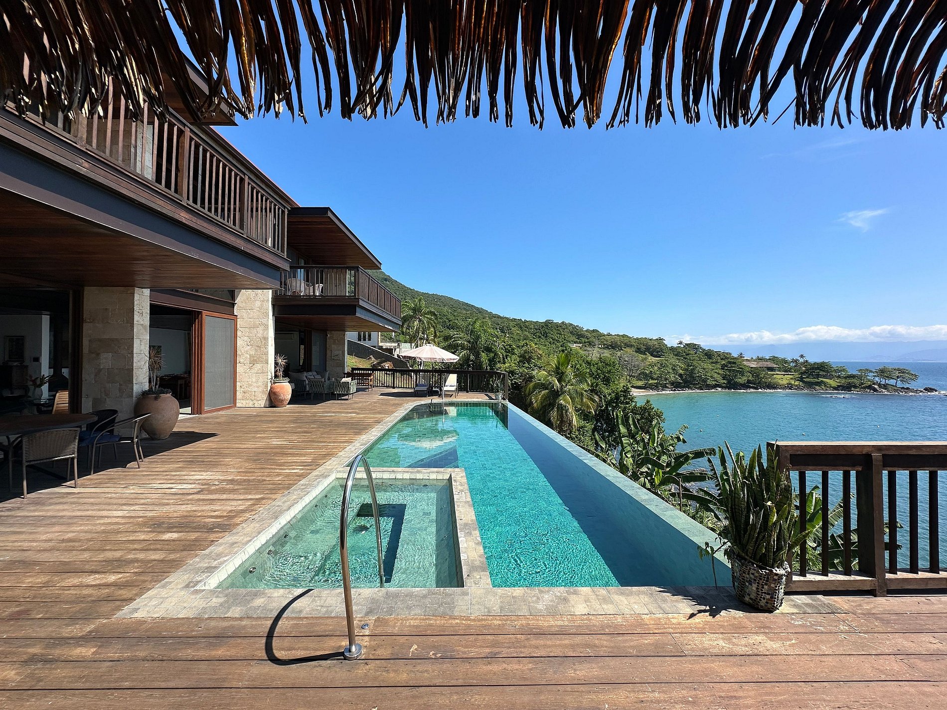 Essa, sem dúvida, é uma das experiências mais incríveis de Ilhabela! Casa que une a arquitetura moderna e o charme do rústico, com vista panorâmica para mar e montanha. Muito conforto e privacidade, no exclusivo Condomínio Ecológico Pacuíba, com acesso direto à praia. Ideal para 16 pessoas. São 8 suítes com ar-condicionado. Salas de estar, jantar e cozinha integradas. Sala de TV, Smart TV e Wi-fi. Piscina aquecida, jacuzzi, espaço gourmet, adega, píer exclusivo e 3 poitas exclusivas no mar.