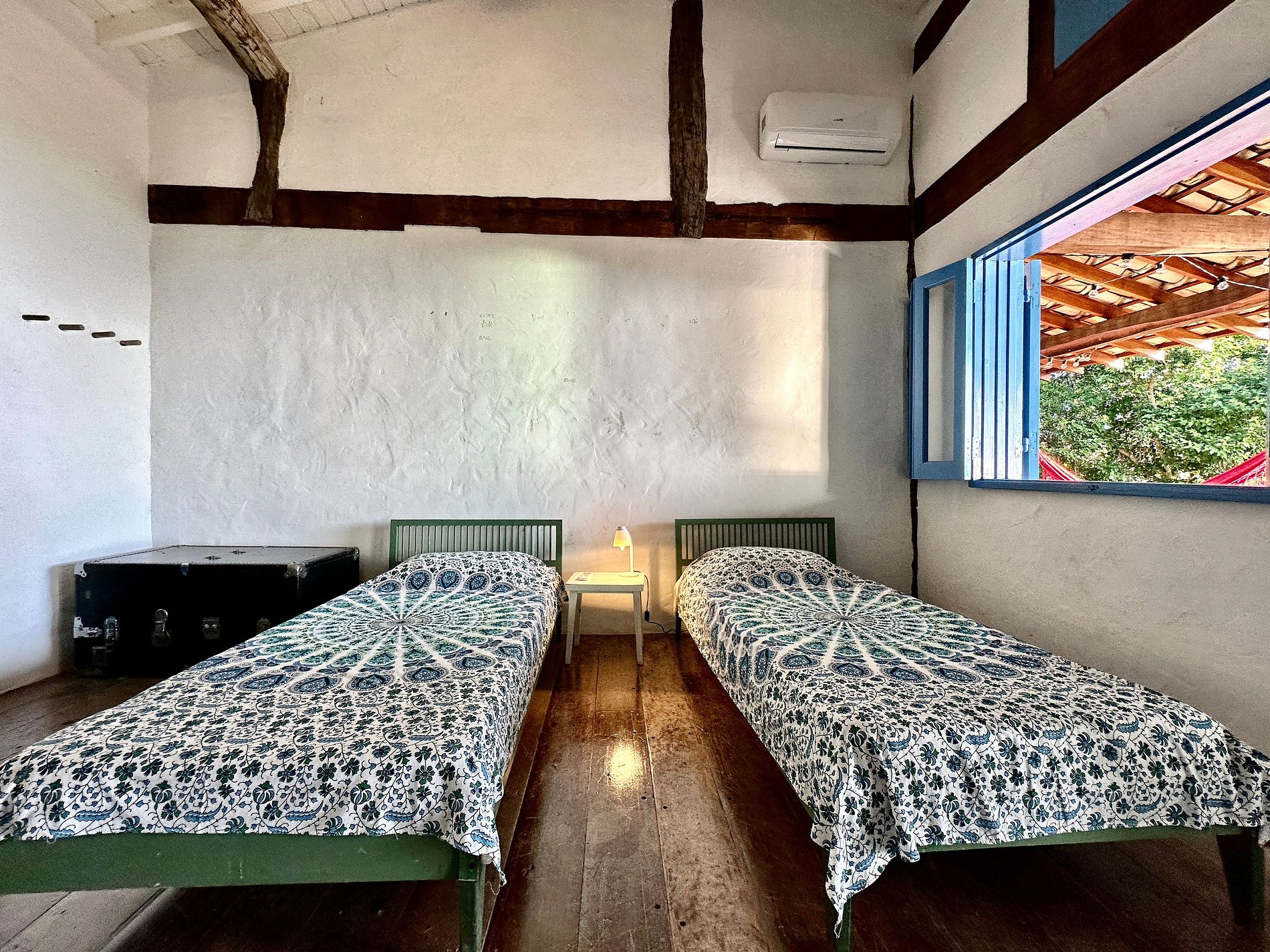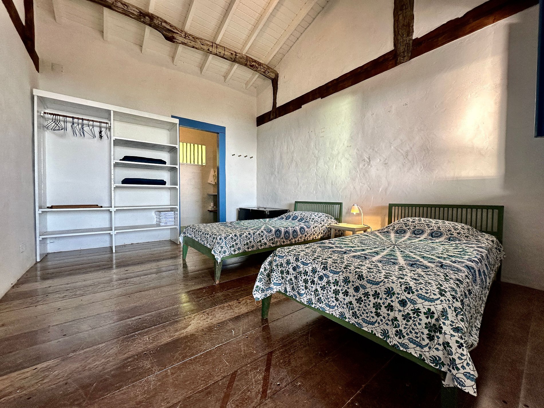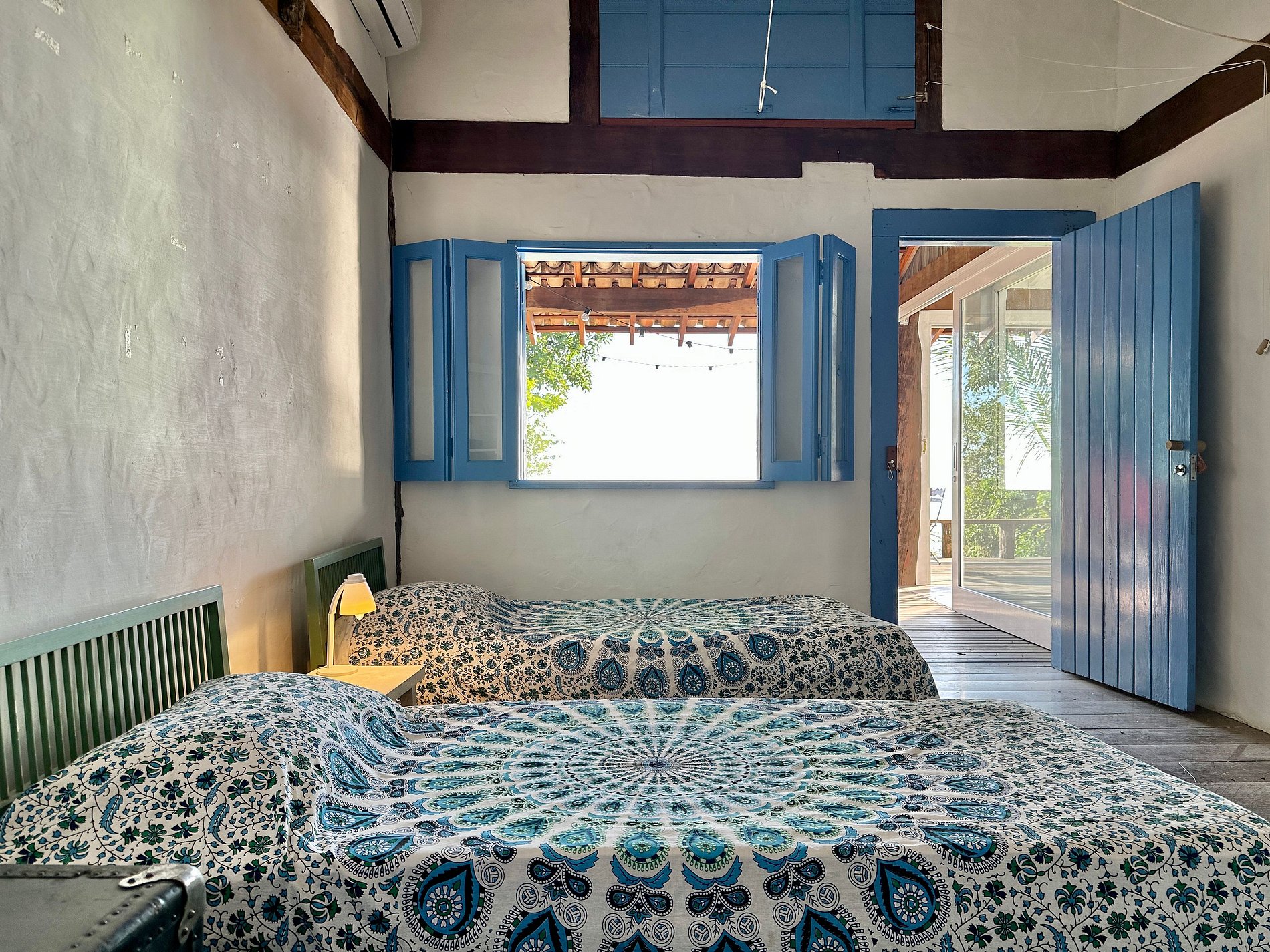 Suíte 2 - 2 camas de solteiro, armário aberto, enxoval completo e acesso à varanda com vista para o mar.