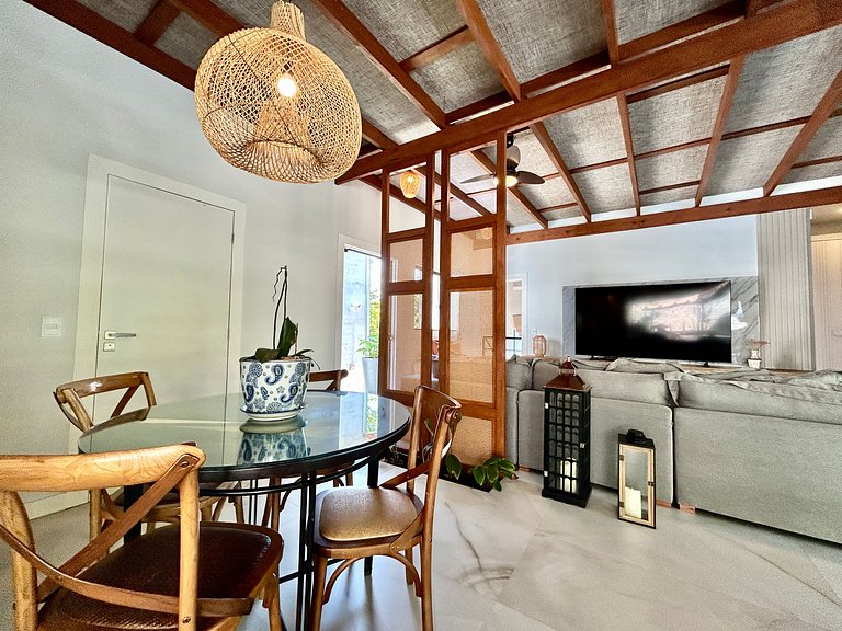 - A área social interna é acolhedora, agradável e com uma decoração de muito bom gosto. No térreo há um lavabo, salas de estar, jantar, varanda e cozinha moderna, em ambiente integrado;