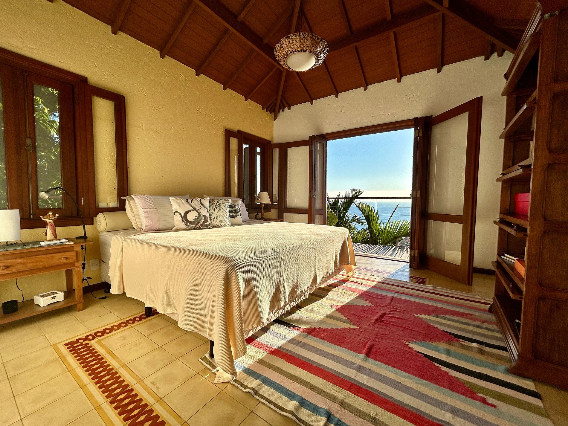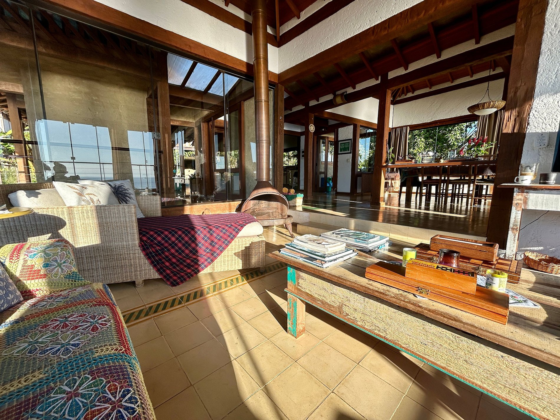 A área externa é um show à parte e conta com ampla varanda gourmet com churrasqueira, forno a lenha e de pizza, piscina, jardim e uma vista deslumbrante para o mar, com direito a um dos mais belos fins de tarde da ilha. Neste espaço também estão as salas de estar com lareira, jantar e TV;