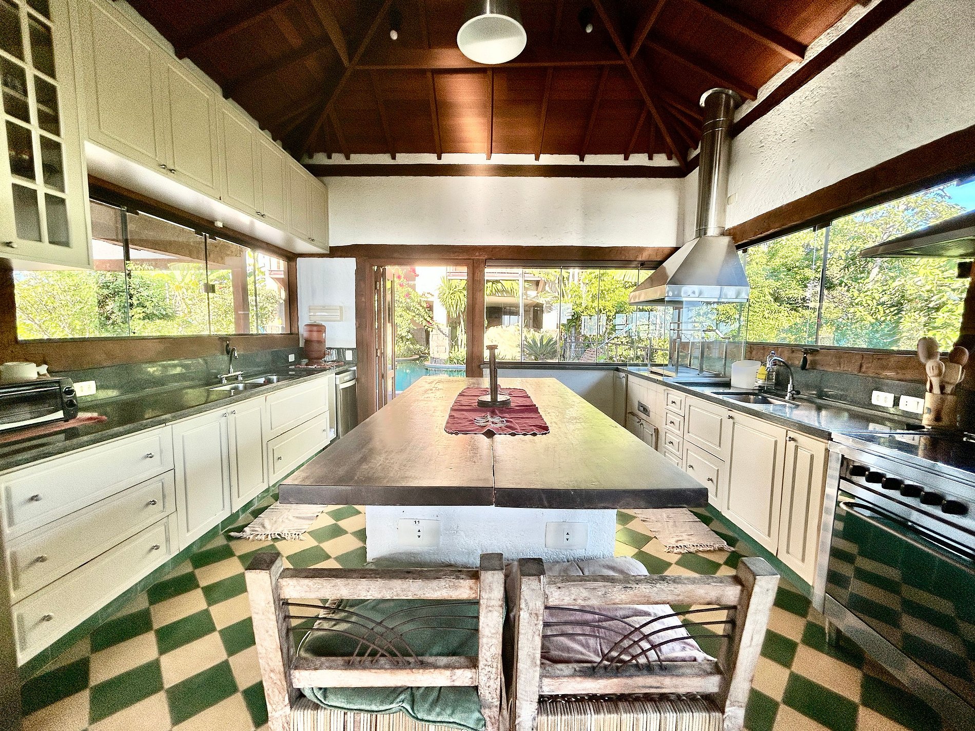 A área externa é um show à parte e conta com ampla varanda gourmet com churrasqueira, forno a lenha e de pizza, piscina, jardim e uma vista deslumbrante para o mar, com direito a um dos mais belos fins de tarde da ilha. Neste espaço também estão as salas de estar com lareira, jantar e TV;