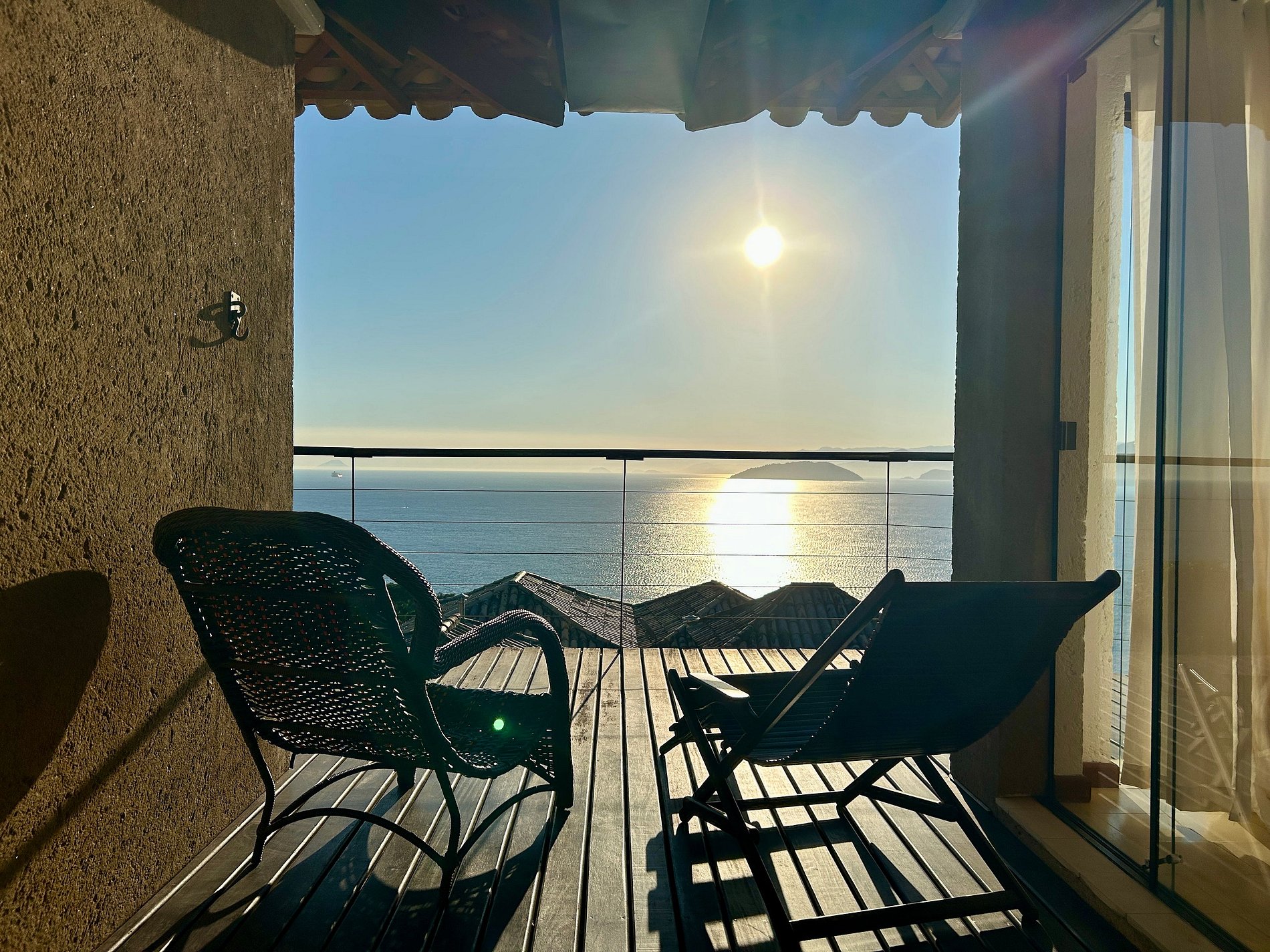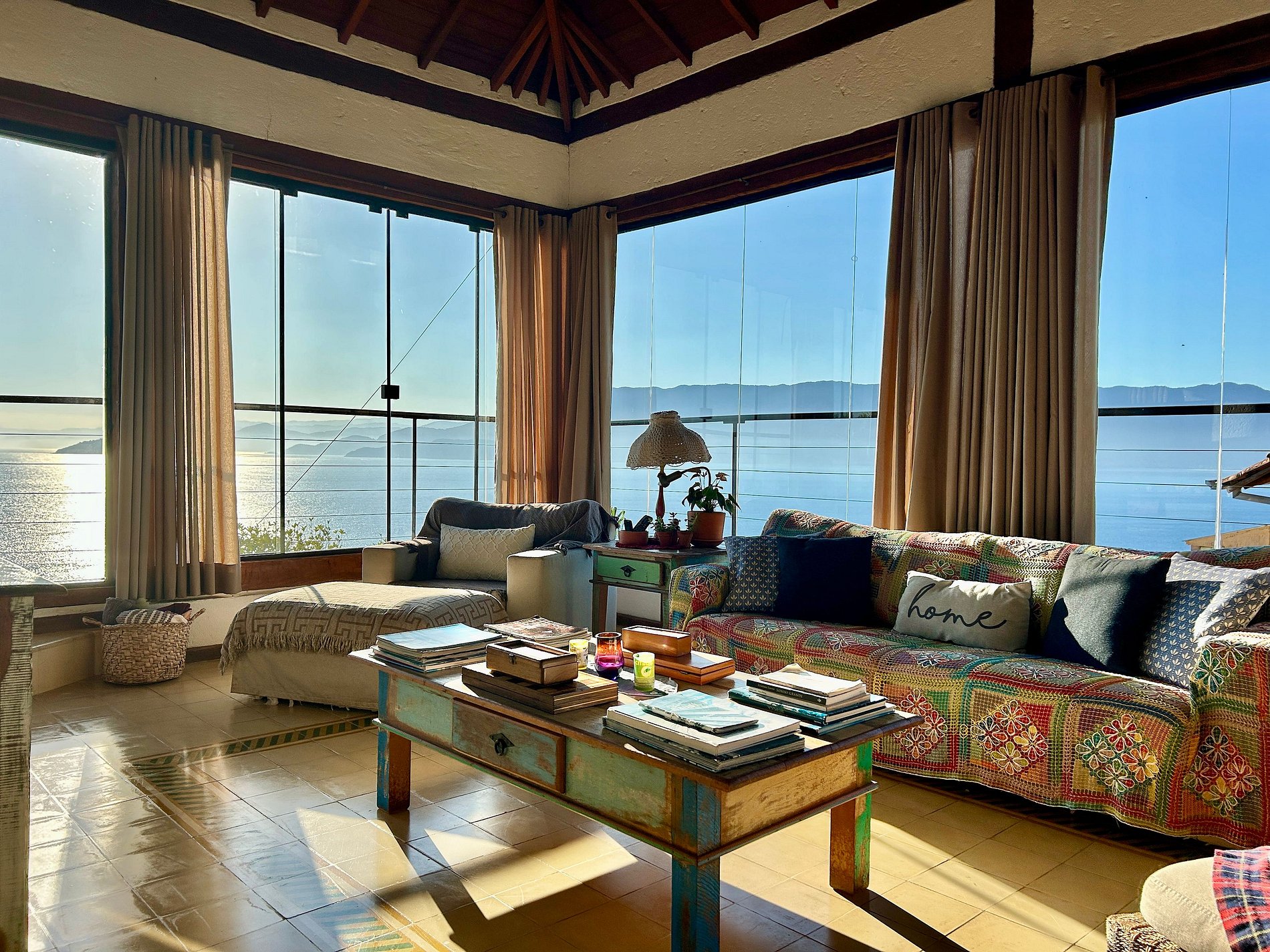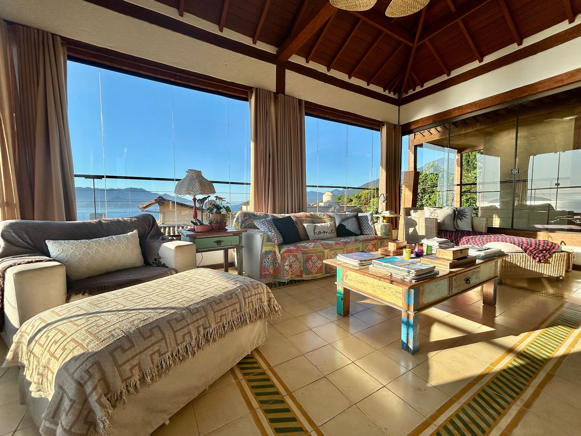 Enorme varanda que circula a área de suítes, com vista de 180 graus de mar e montanha