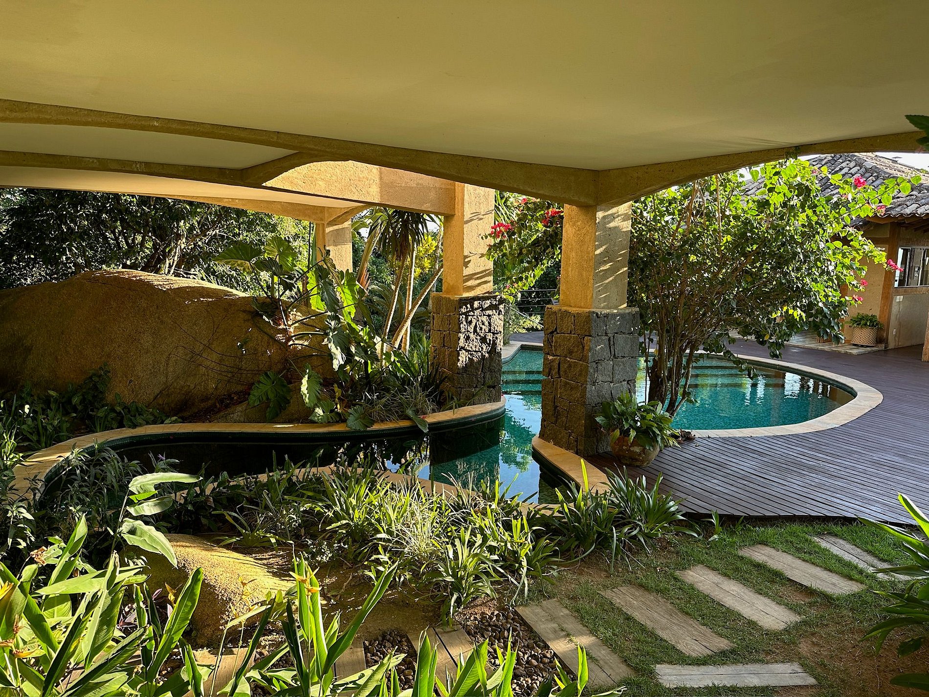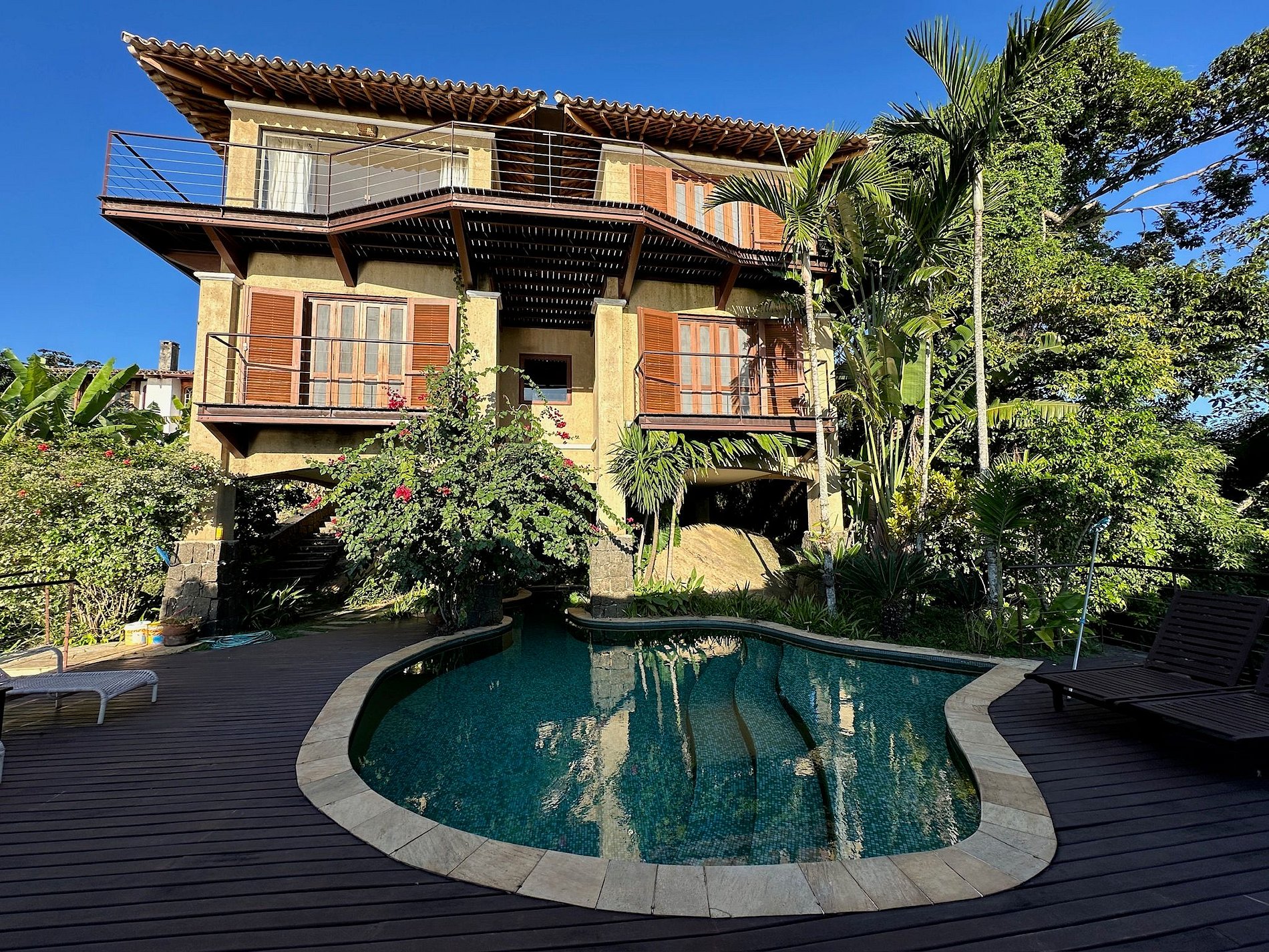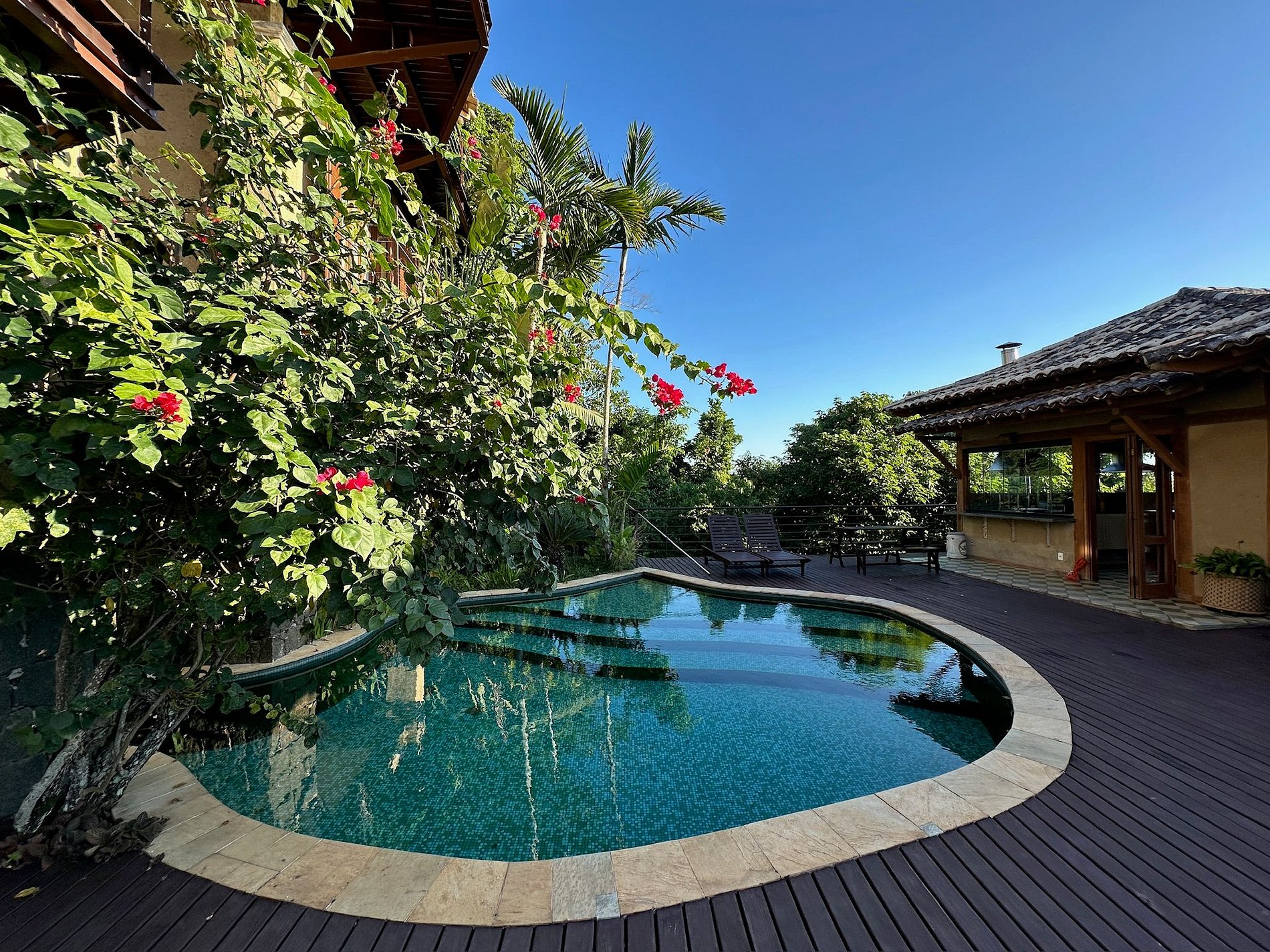 Belíssima casa, projetada por Luiz Alberto Hopf, com um visual deslumbrante de mar/montanha e acesso para piscinas naturais no mar, excelentes para snorkel e pesca. Condomínio completo, com píer, quadra de tênis, futebol e trilhas no Sul da ilha. São 5 suítes e 1 quarto, com ar-condicionado.