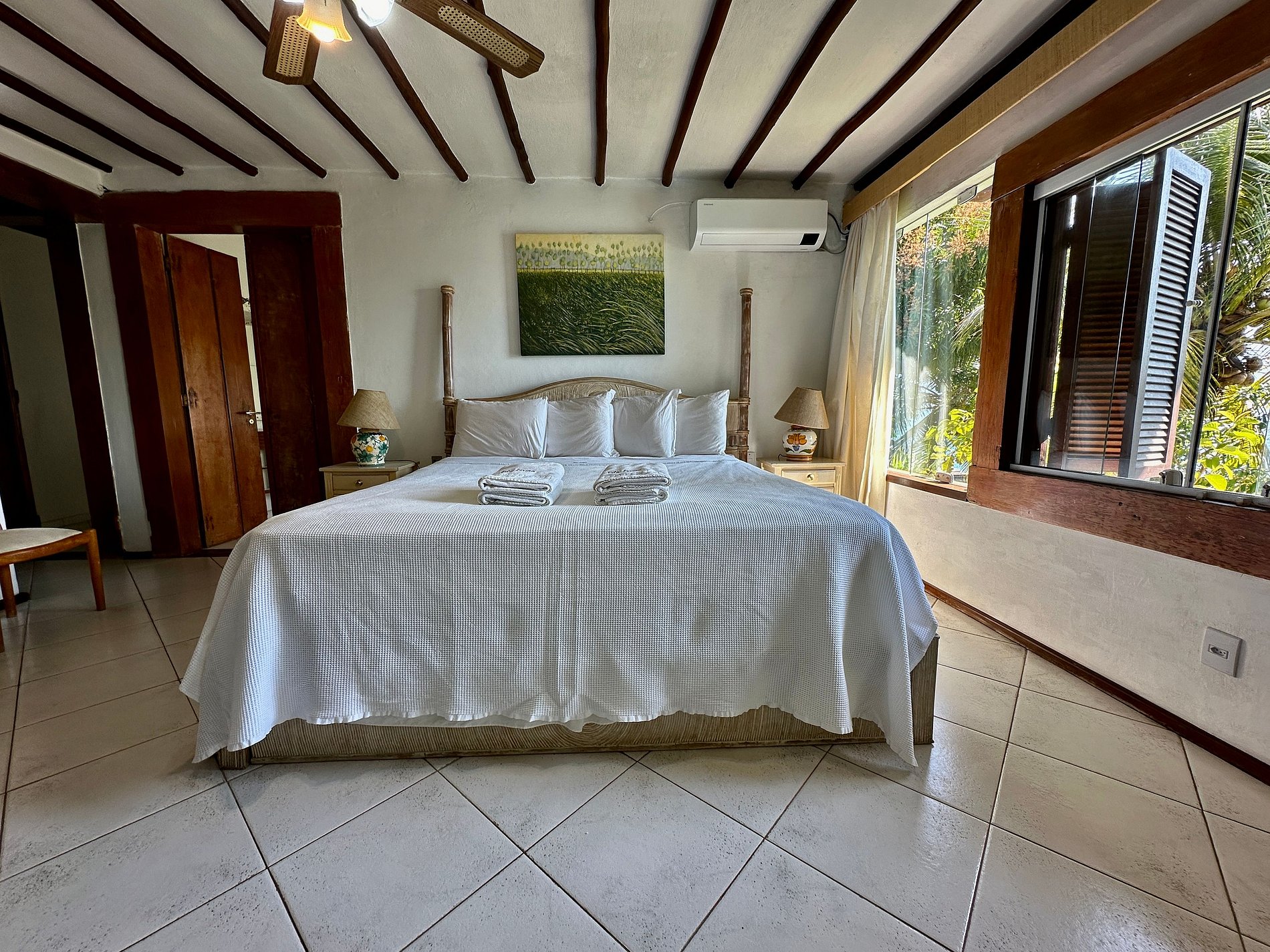 São 5 suítes, todas com ar-condicionado e secador de cabelo, que estão na seguinte configuração: