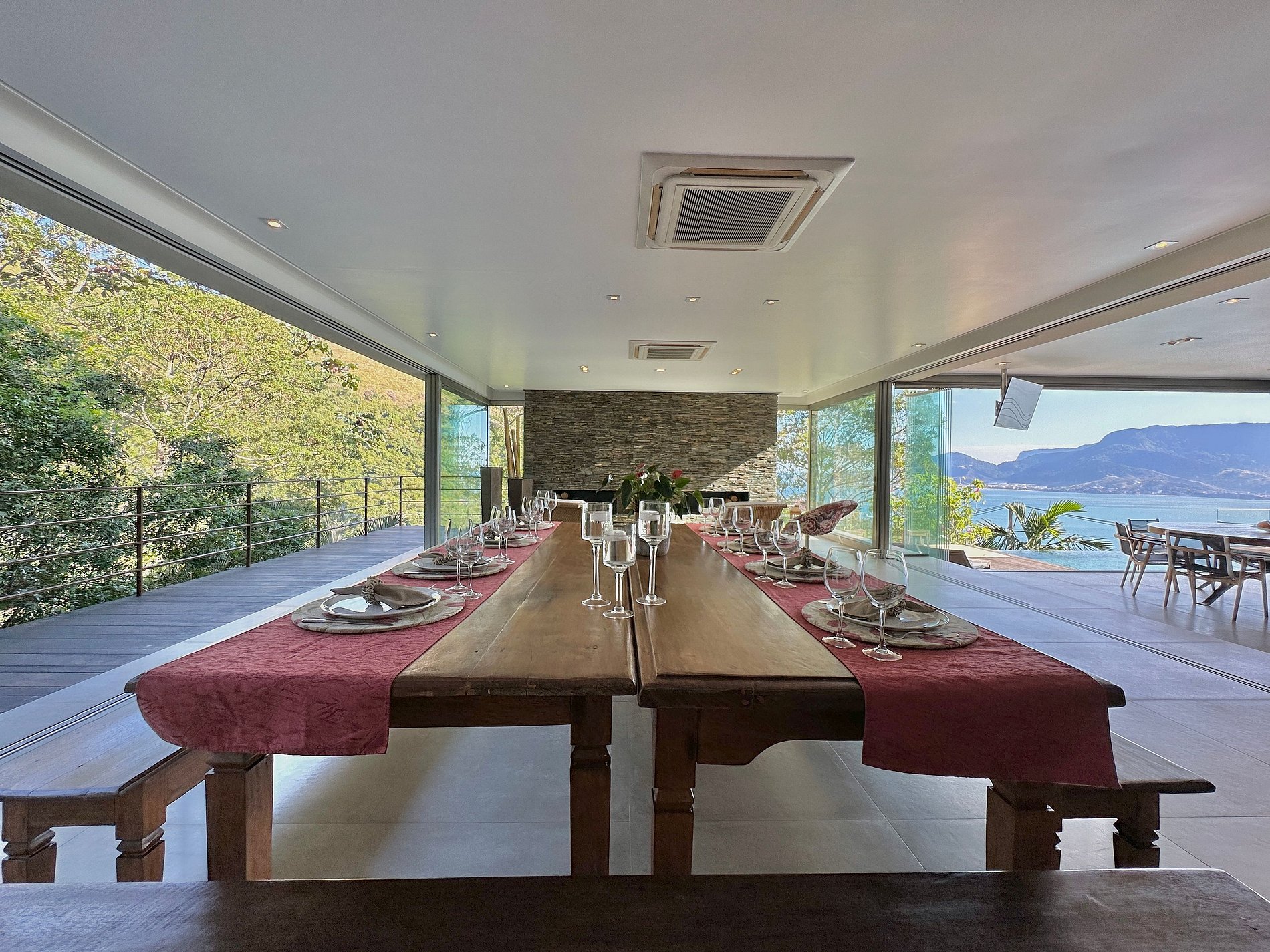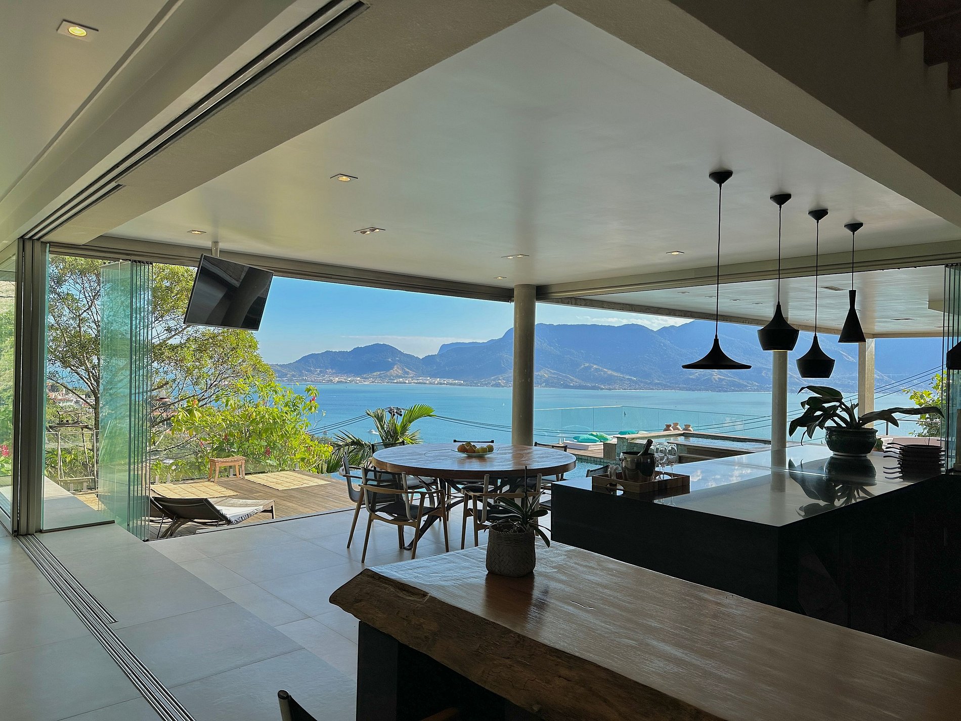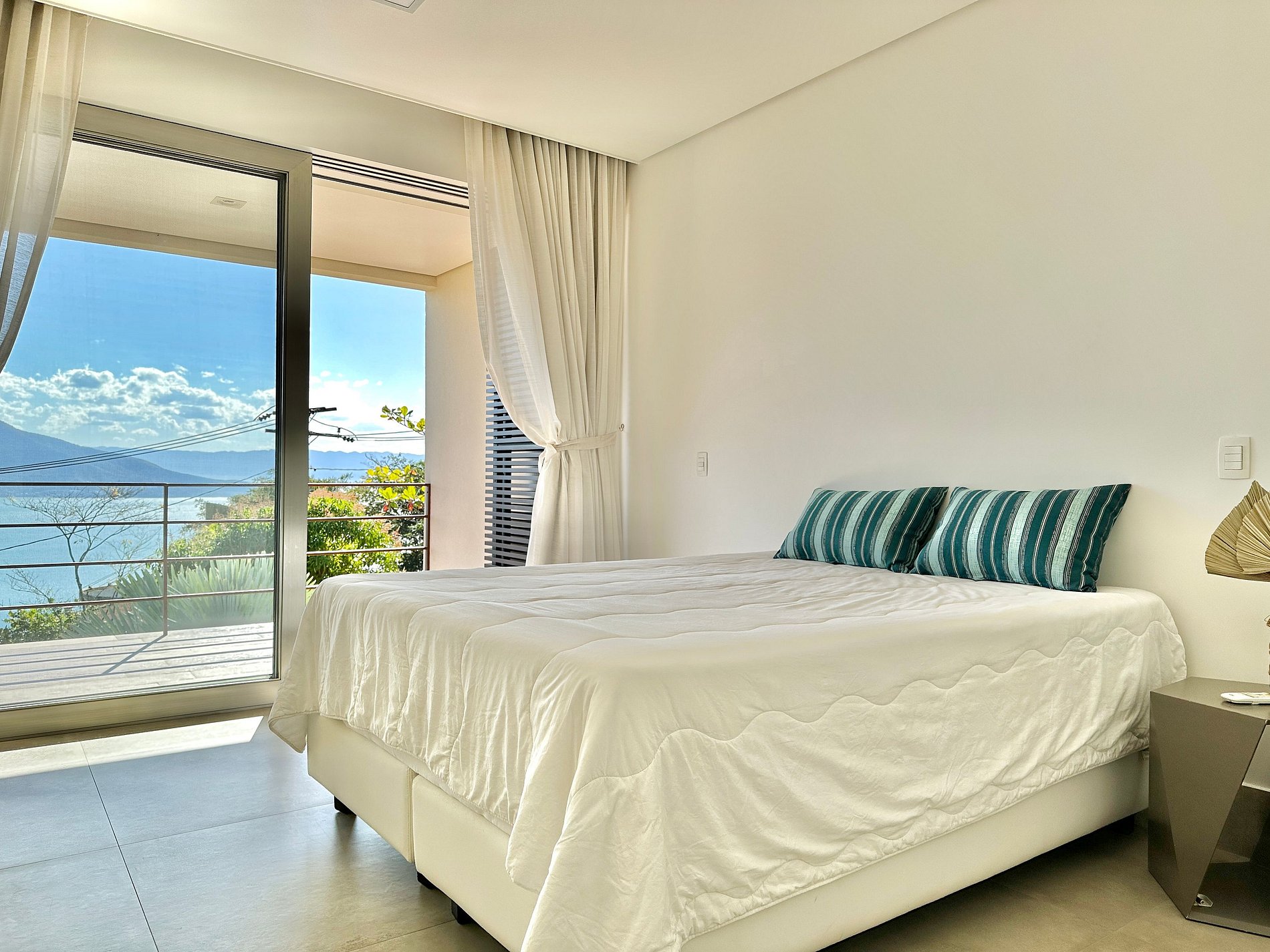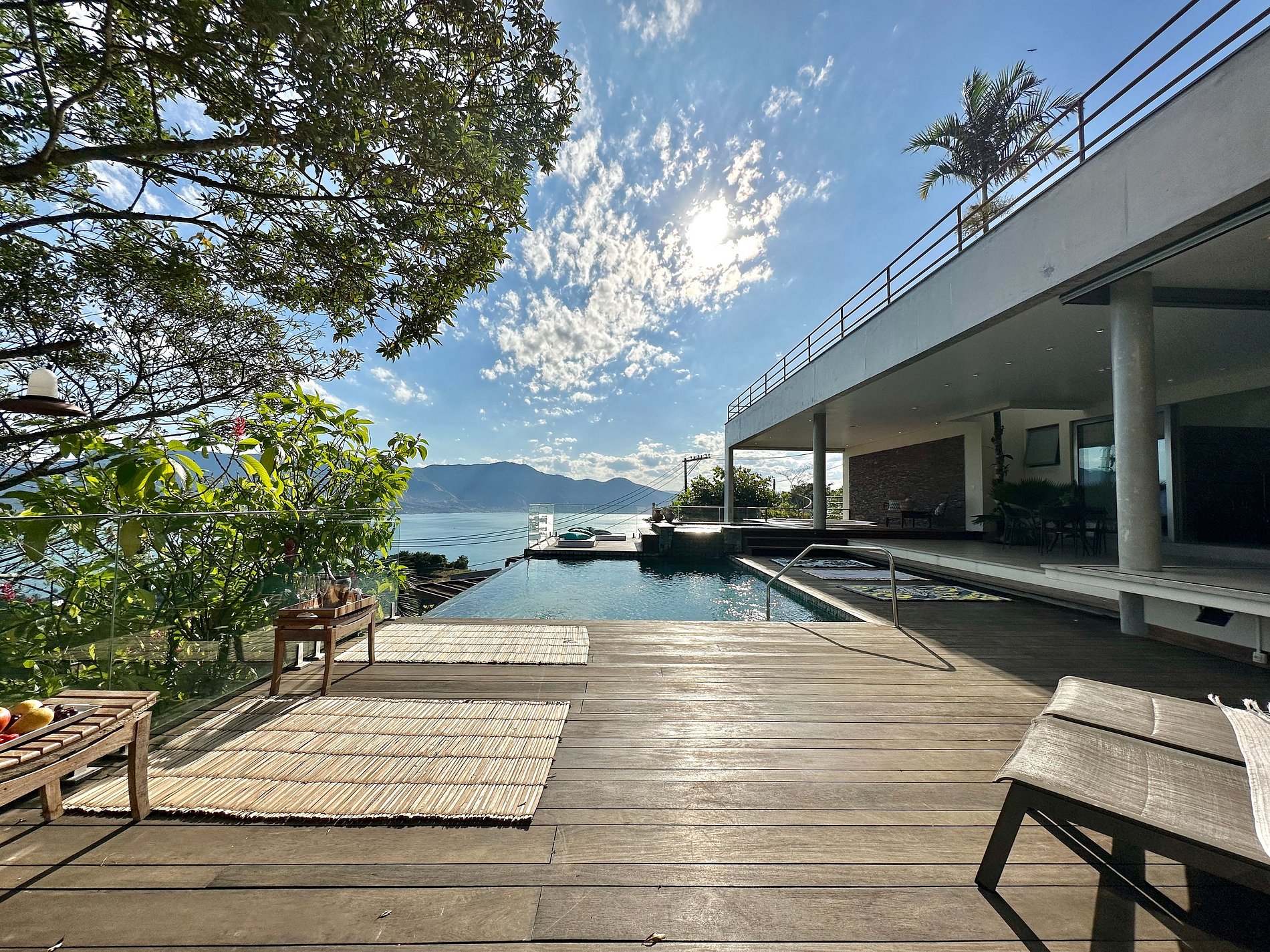 Casa moderna e luxuosa, no condomínio fechado Sobre o Mar, no Centro Histórico de Ilhabela. Um refúgio com conforto e requinte, em meio à exuberante Mata Atlântica. Ideal para 13 pessoas. São 5 suítes com vista para o mar e 2 quartos, todos com ar-condicionado. Áreas sociais integradas, visão de 180 graus para o canal. Sala de TV, cozinha completa, sala de jantar, lareira, varanda gourmet com churrasqueira, forno de pizza, máquina de gelo, piscina com borda infinita aquecida, SPA aquecido, sauna e fogueira externa.