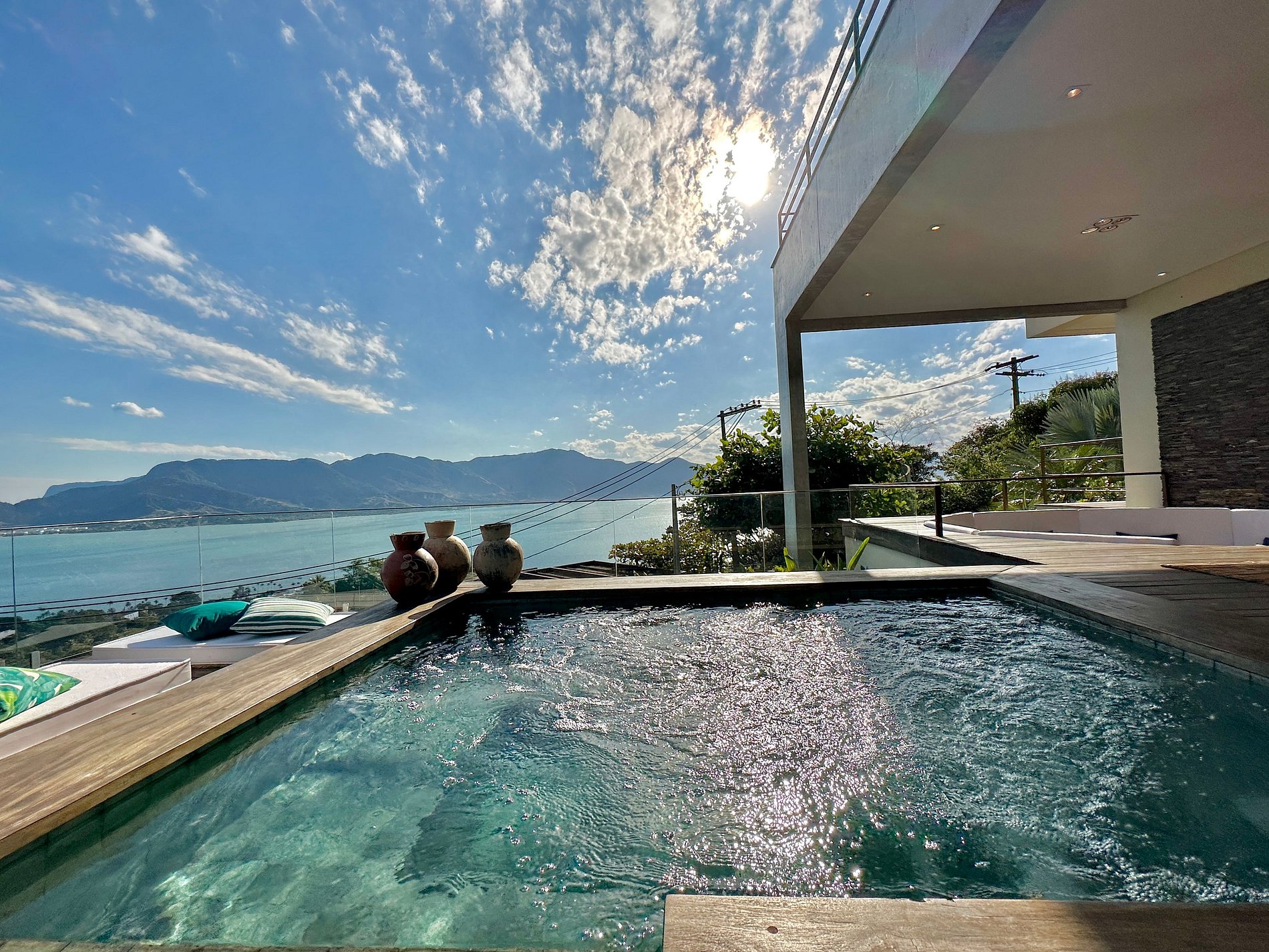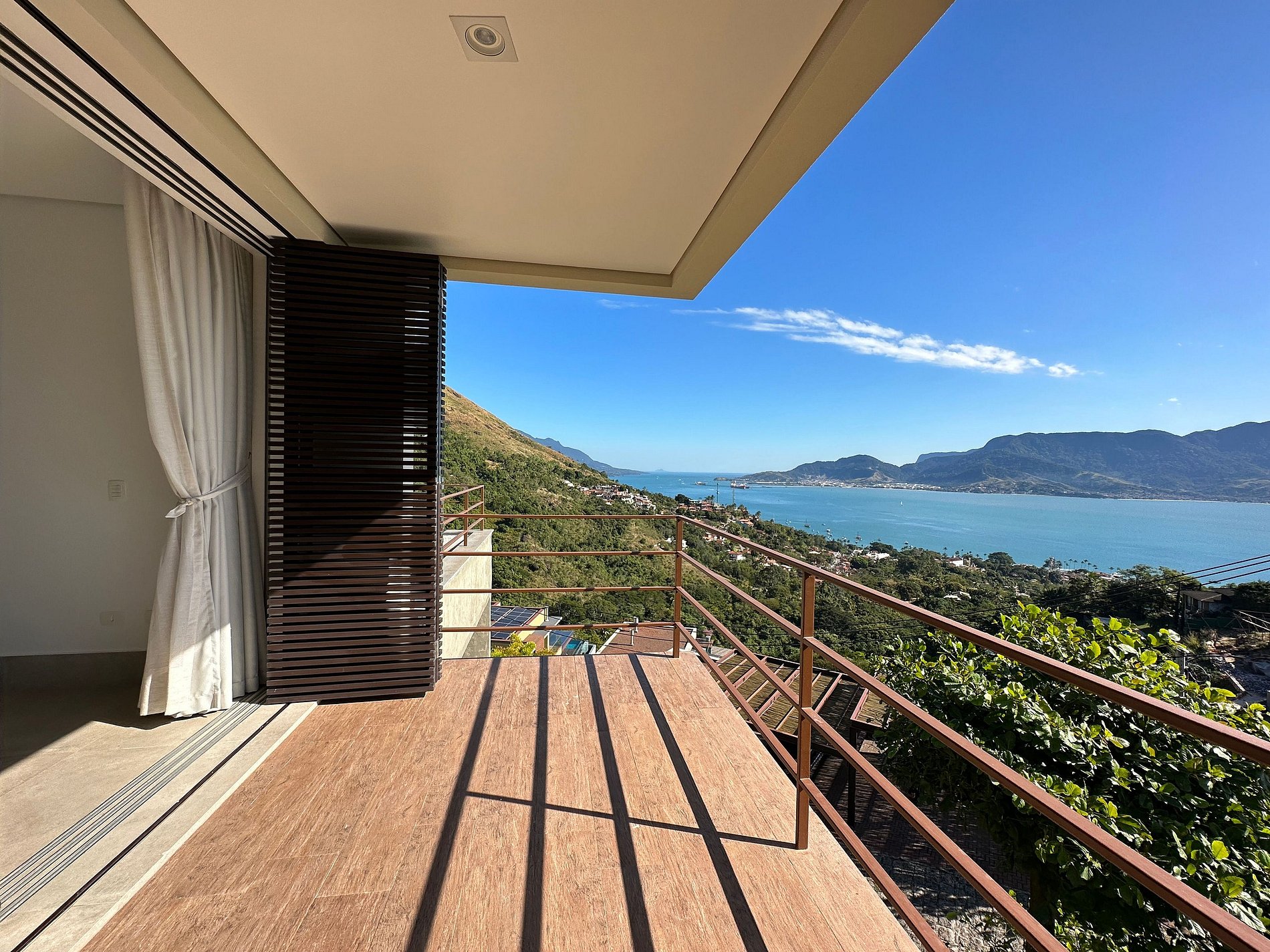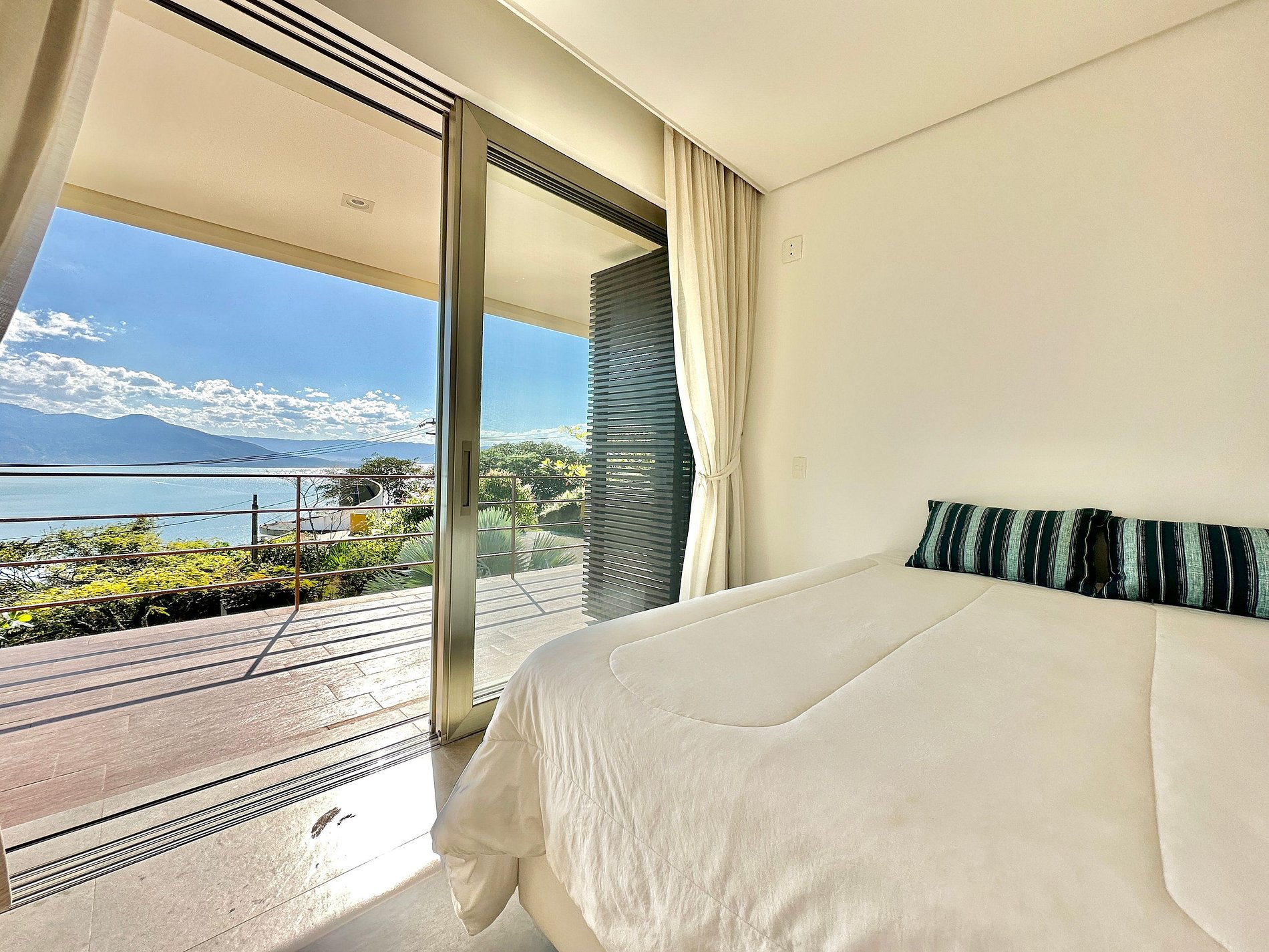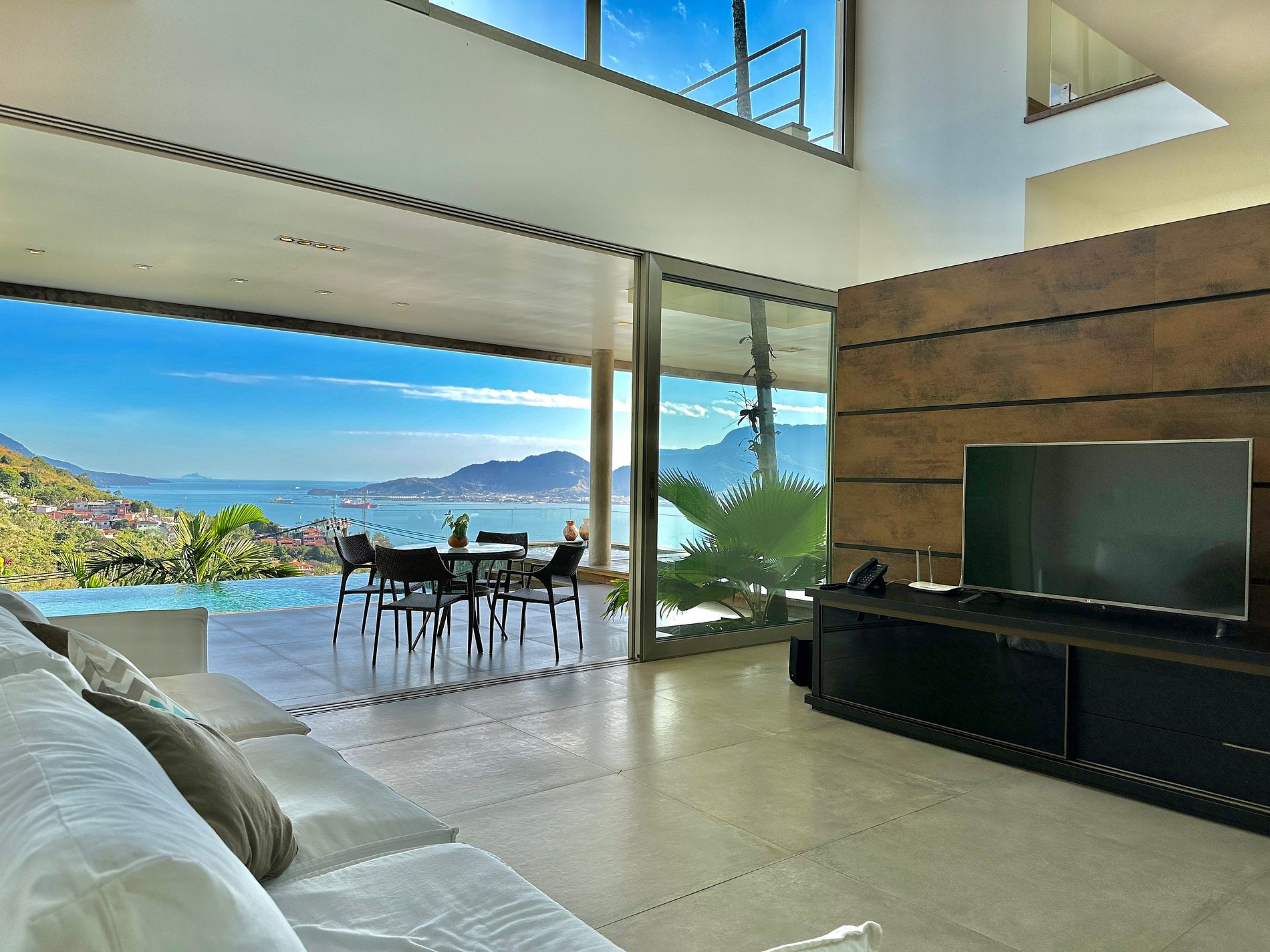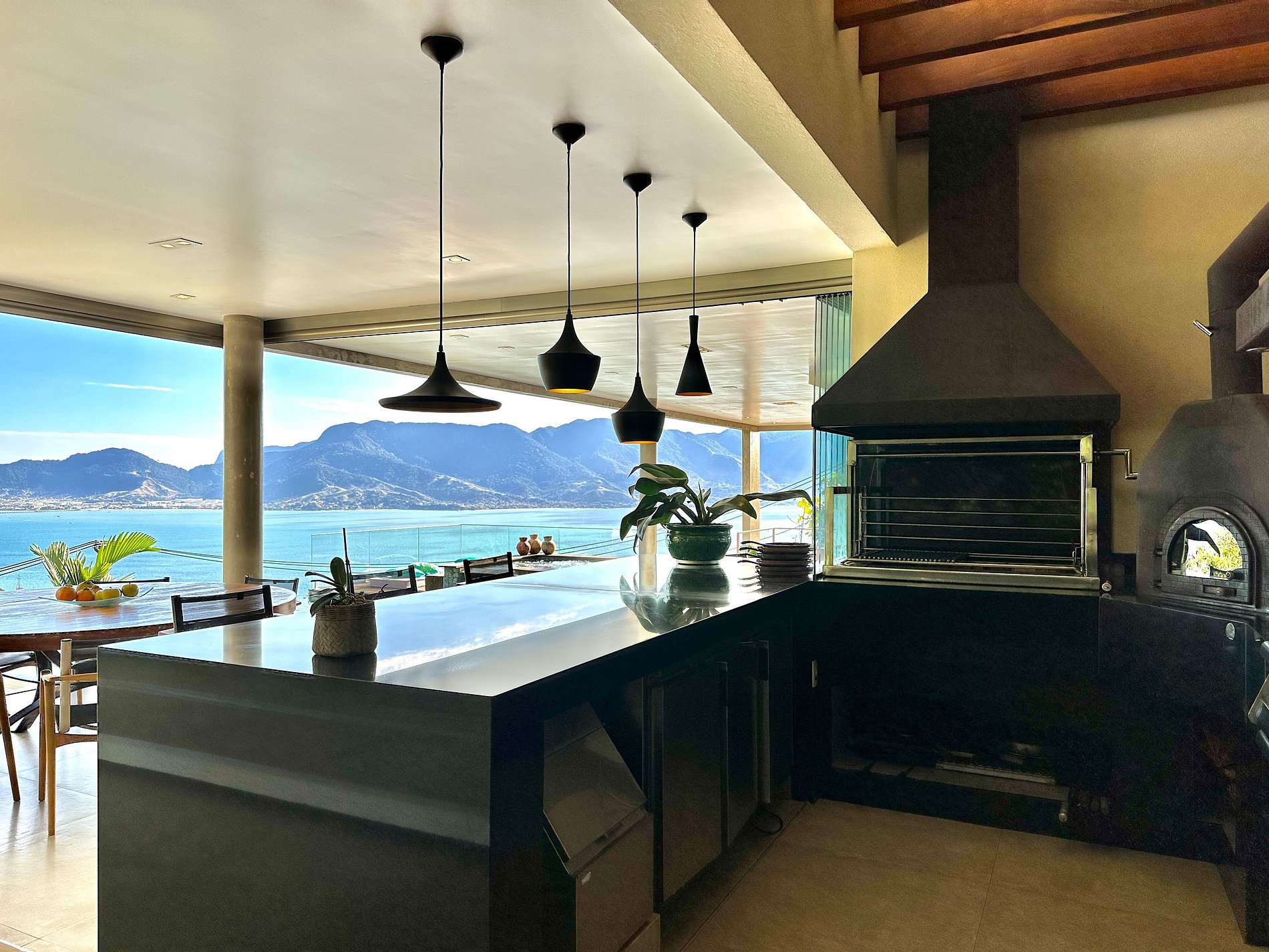 Casa moderna e luxuosa, no condomínio fechado Sobre o Mar, no Centro Histórico de Ilhabela. Um refúgio com conforto e requinte, em meio à exuberante Mata Atlântica. Ideal para 13 pessoas. São 5 suítes com vista para o mar e 2 quartos, todos com ar-condicionado. Áreas sociais integradas, visão de 180 graus para o canal. Sala de TV, cozinha completa, sala de jantar, lareira, varanda gourmet com churrasqueira, forno de pizza, máquina de gelo, piscina com borda infinita aquecida, SPA aquecido, sauna e fogueira externa.