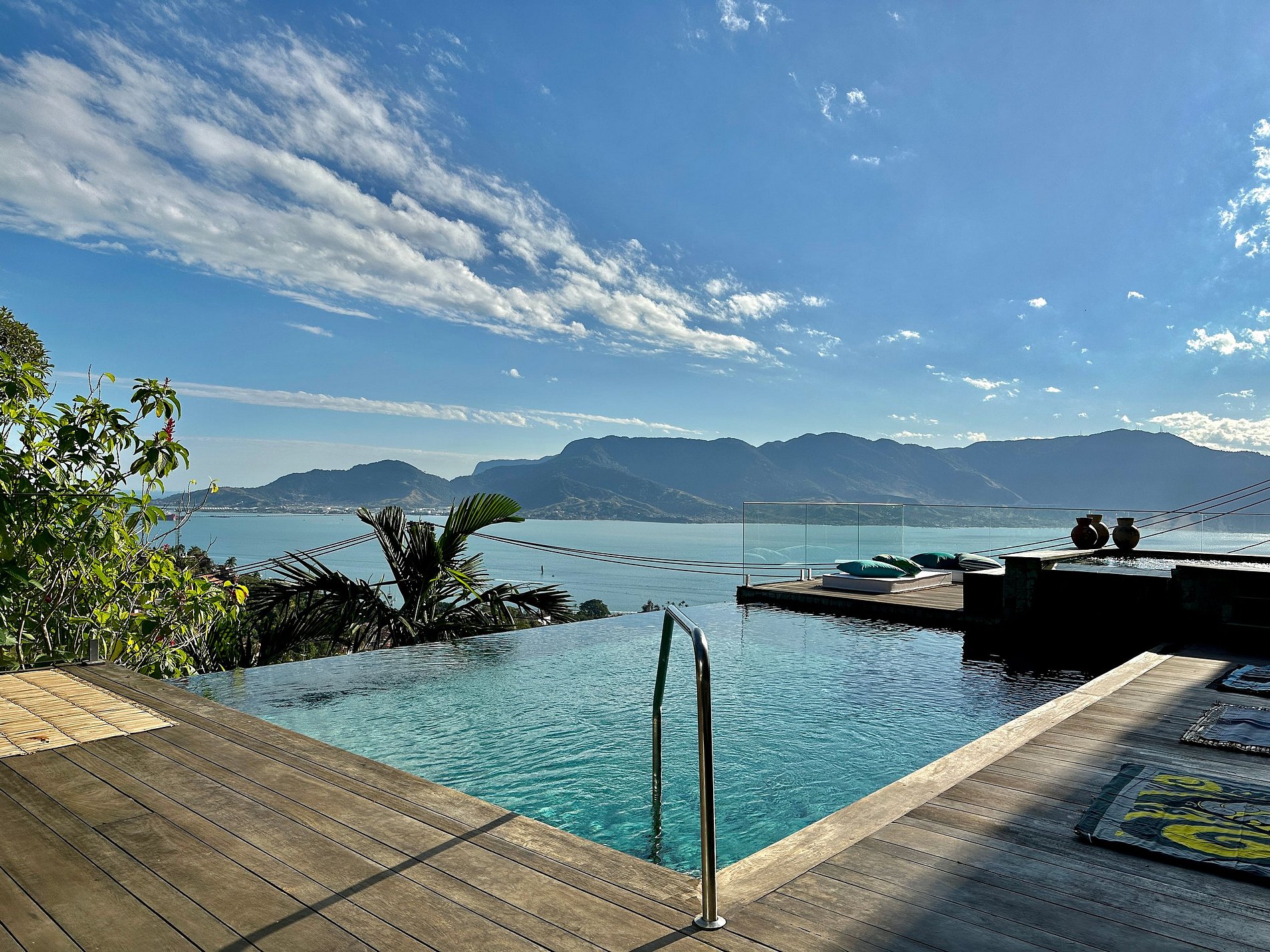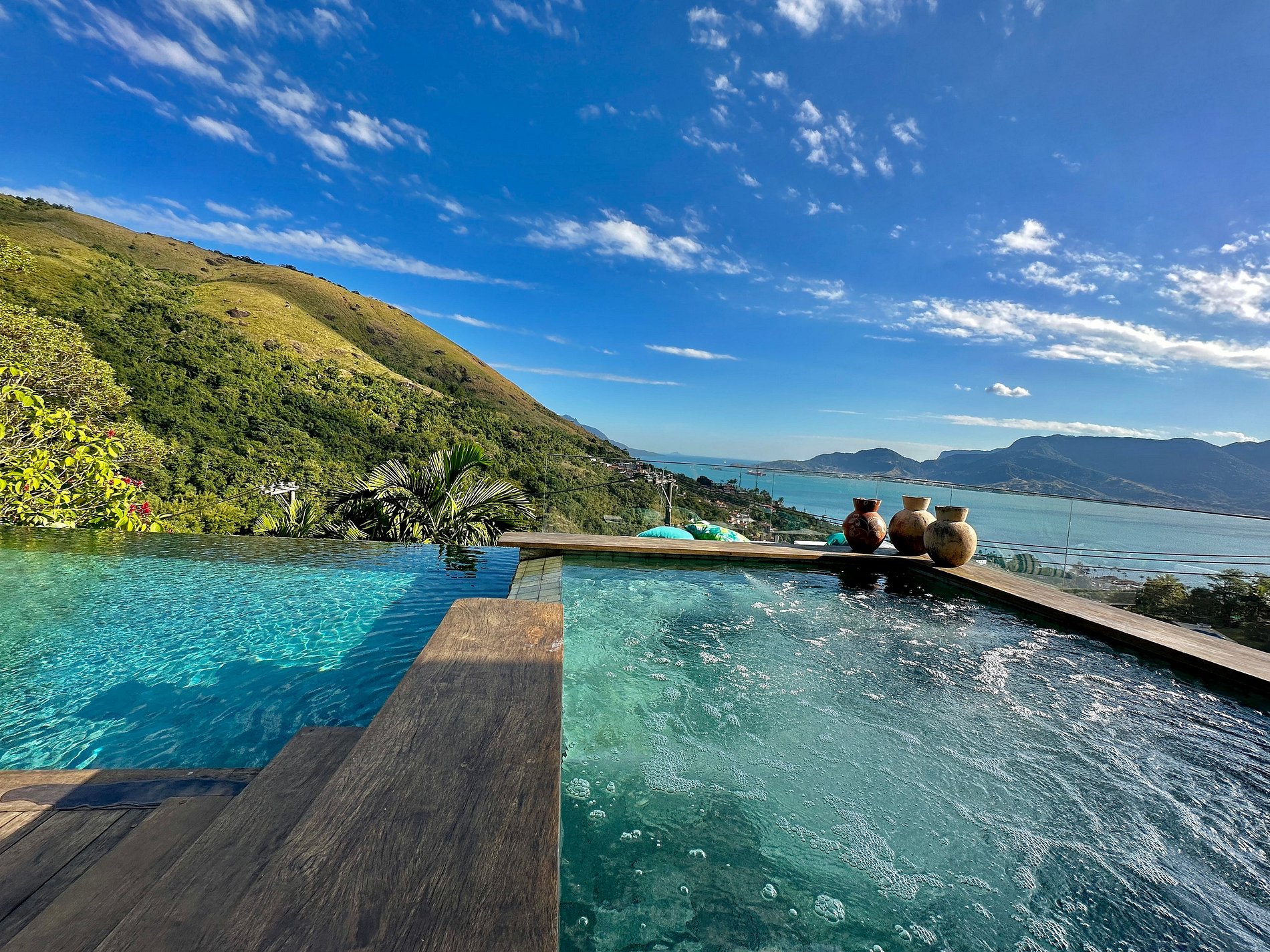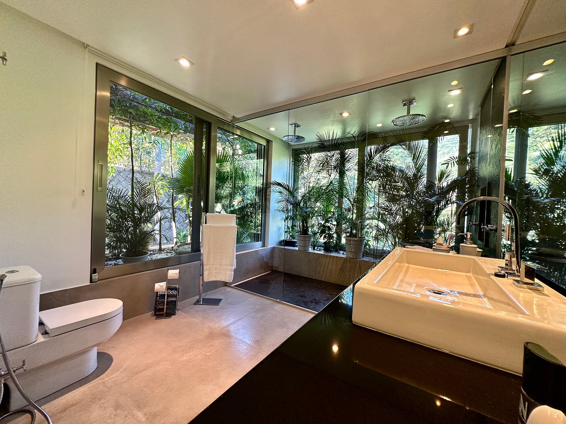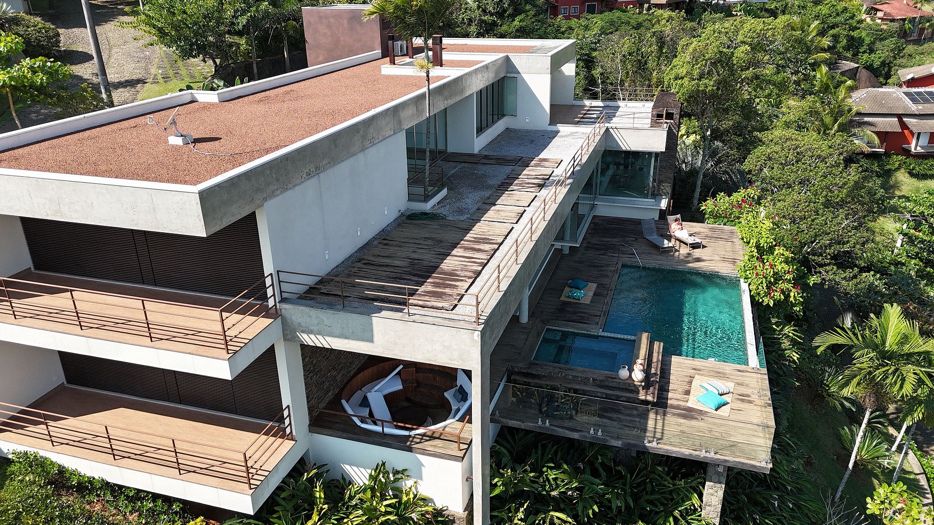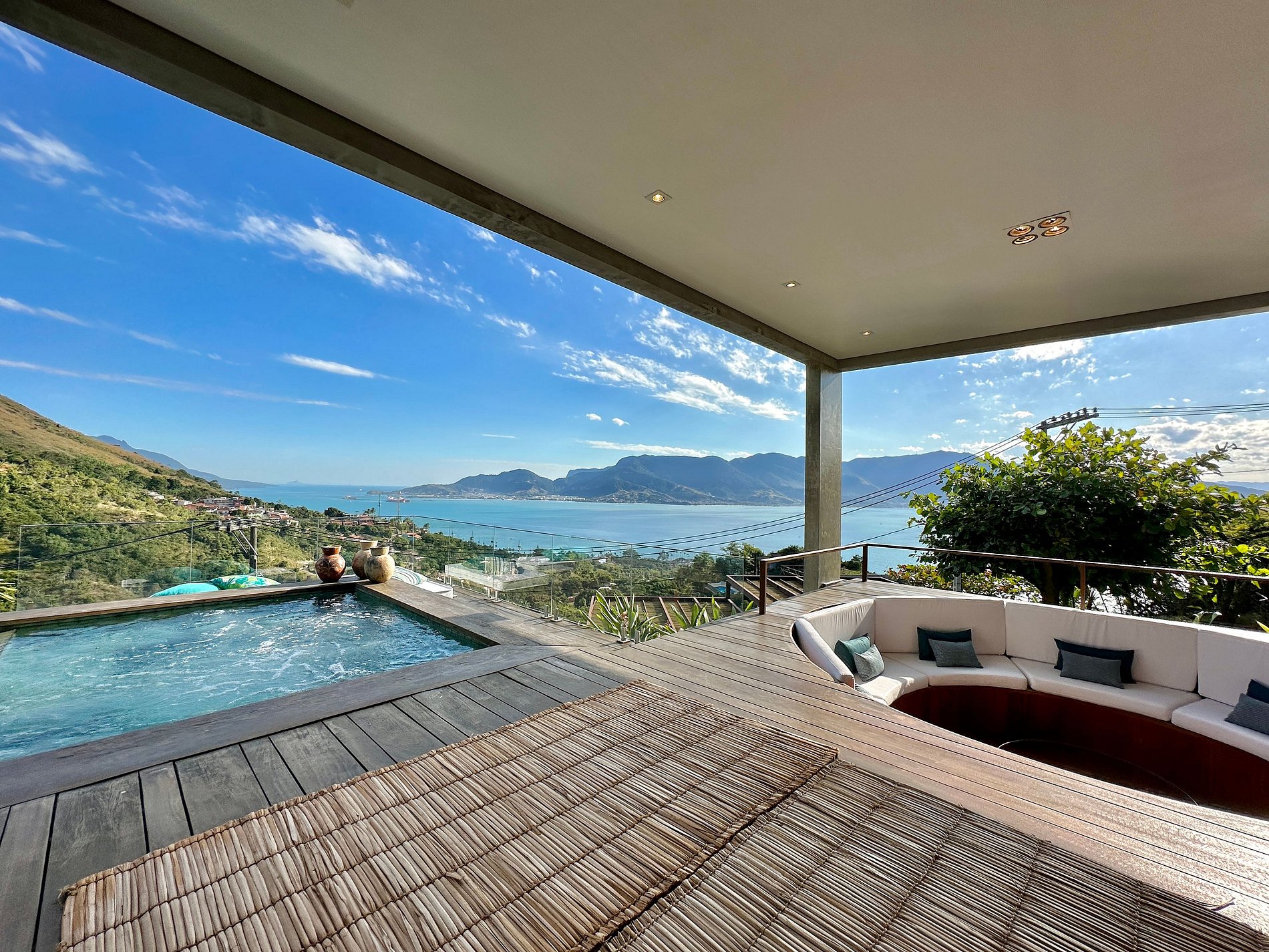 Casa moderna e luxuosa, no condomínio fechado Sobre o Mar, no Centro Histórico de Ilhabela. Um refúgio com conforto e requinte, em meio à exuberante Mata Atlântica. Ideal para 13 pessoas. São 5 suítes com vista para o mar e 2 quartos, todos com ar-condicionado. Áreas sociais integradas, visão de 180 graus para o canal. Sala de TV, cozinha completa, sala de jantar, lareira, varanda gourmet com churrasqueira, forno de pizza, máquina de gelo, piscina com borda infinita aquecida, SPA aquecido, sauna e fogueira externa.