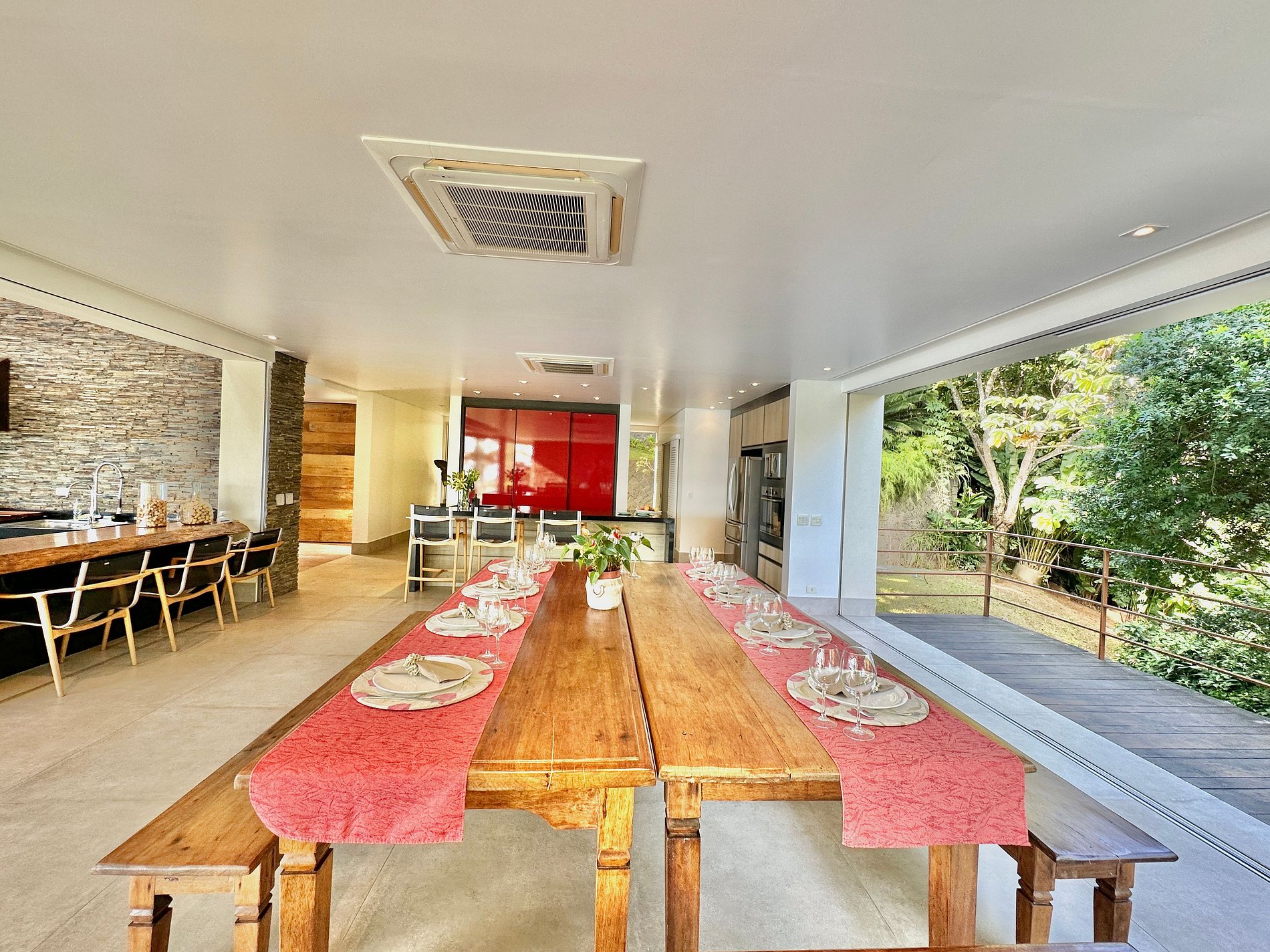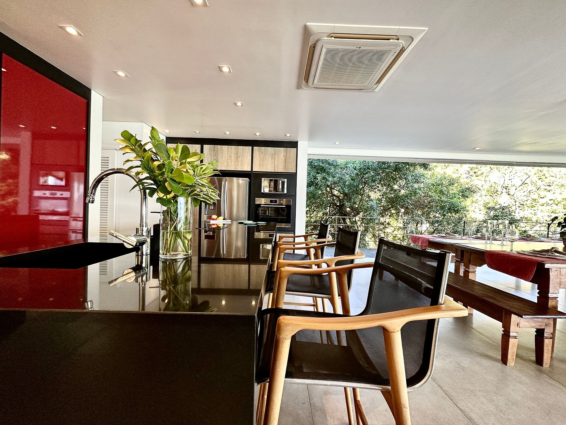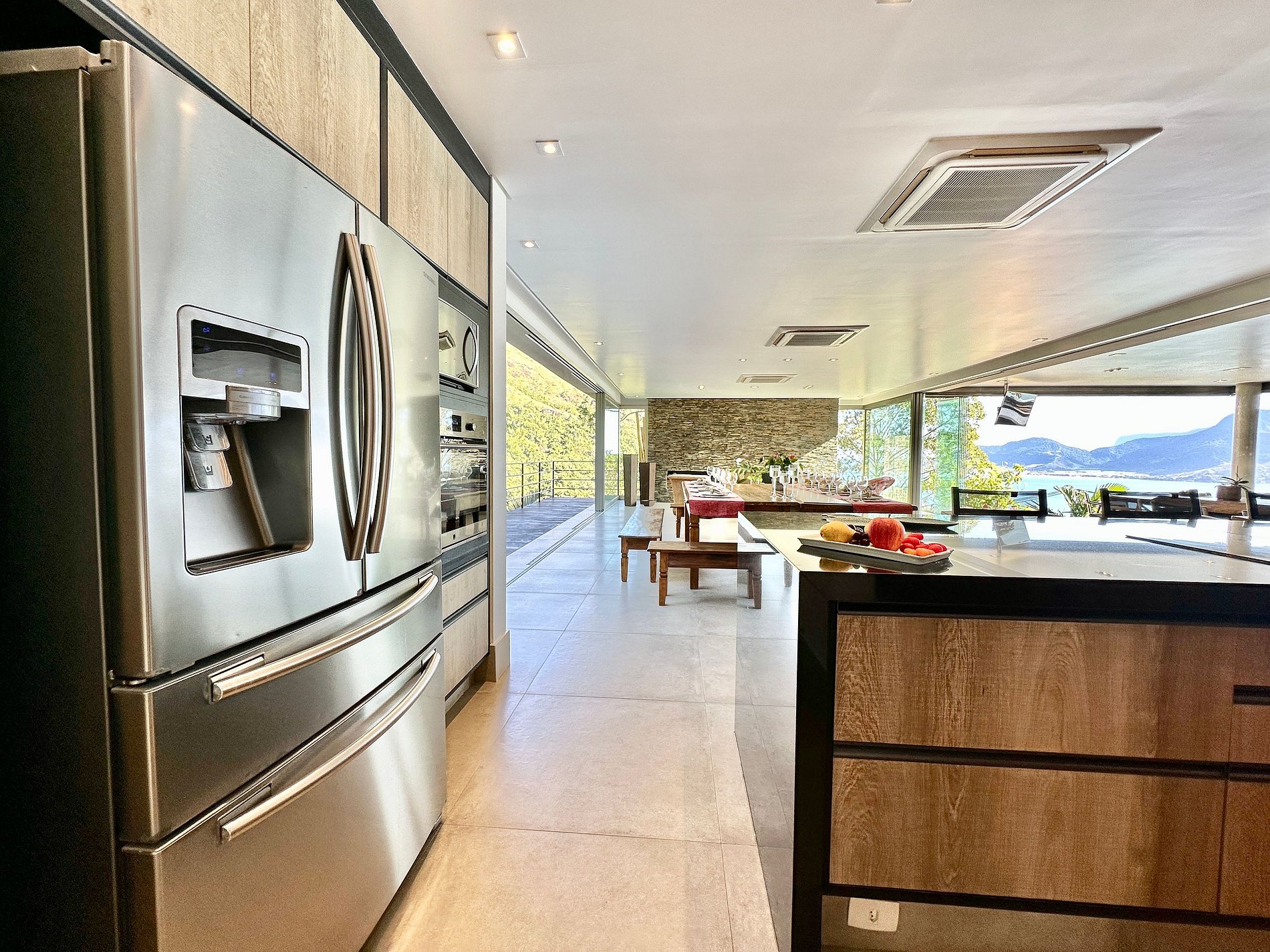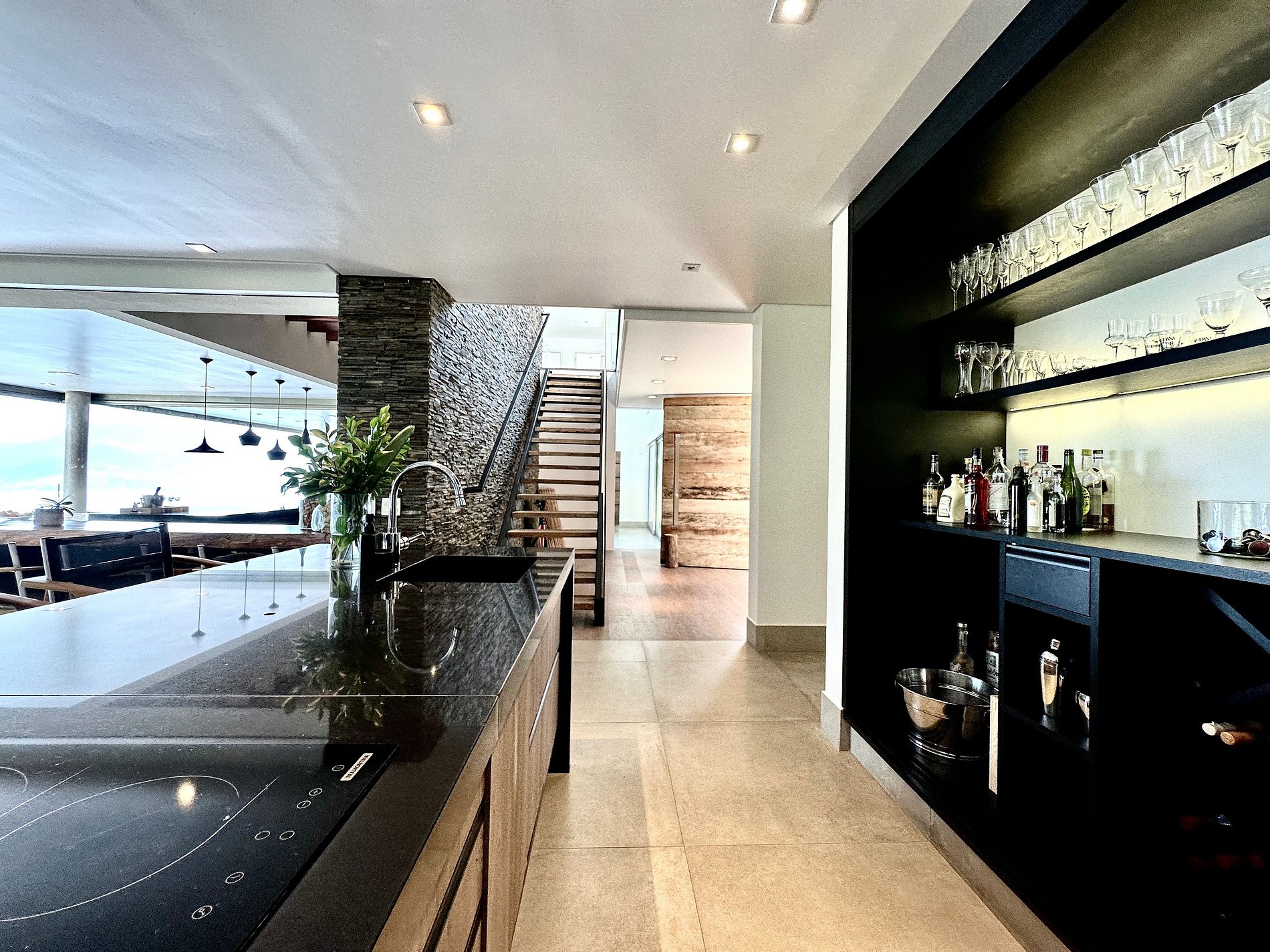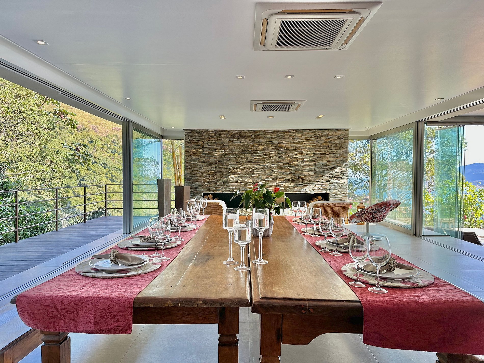 Casa moderna e luxuosa, no condomínio fechado Sobre o Mar, no Centro Histórico de Ilhabela. Um refúgio com conforto e requinte, em meio à exuberante Mata Atlântica. Ideal para 13 pessoas. São 5 suítes com vista para o mar e 2 quartos, todos com ar-condicionado. Áreas sociais integradas, visão de 180 graus para o canal. Sala de TV, cozinha completa, sala de jantar, lareira, varanda gourmet com churrasqueira, forno de pizza, máquina de gelo, piscina com borda infinita aquecida, SPA aquecido, sauna e fogueira externa.