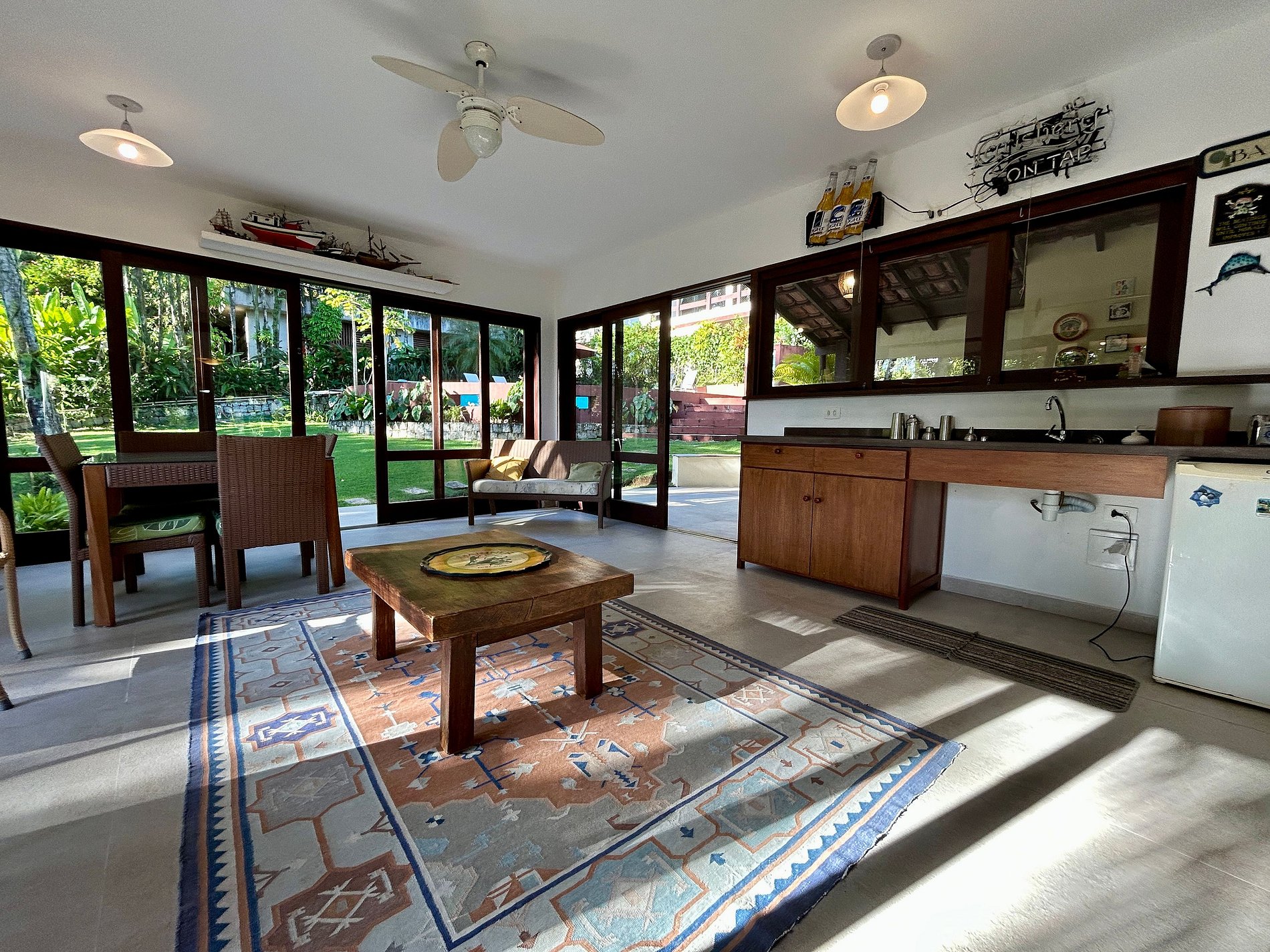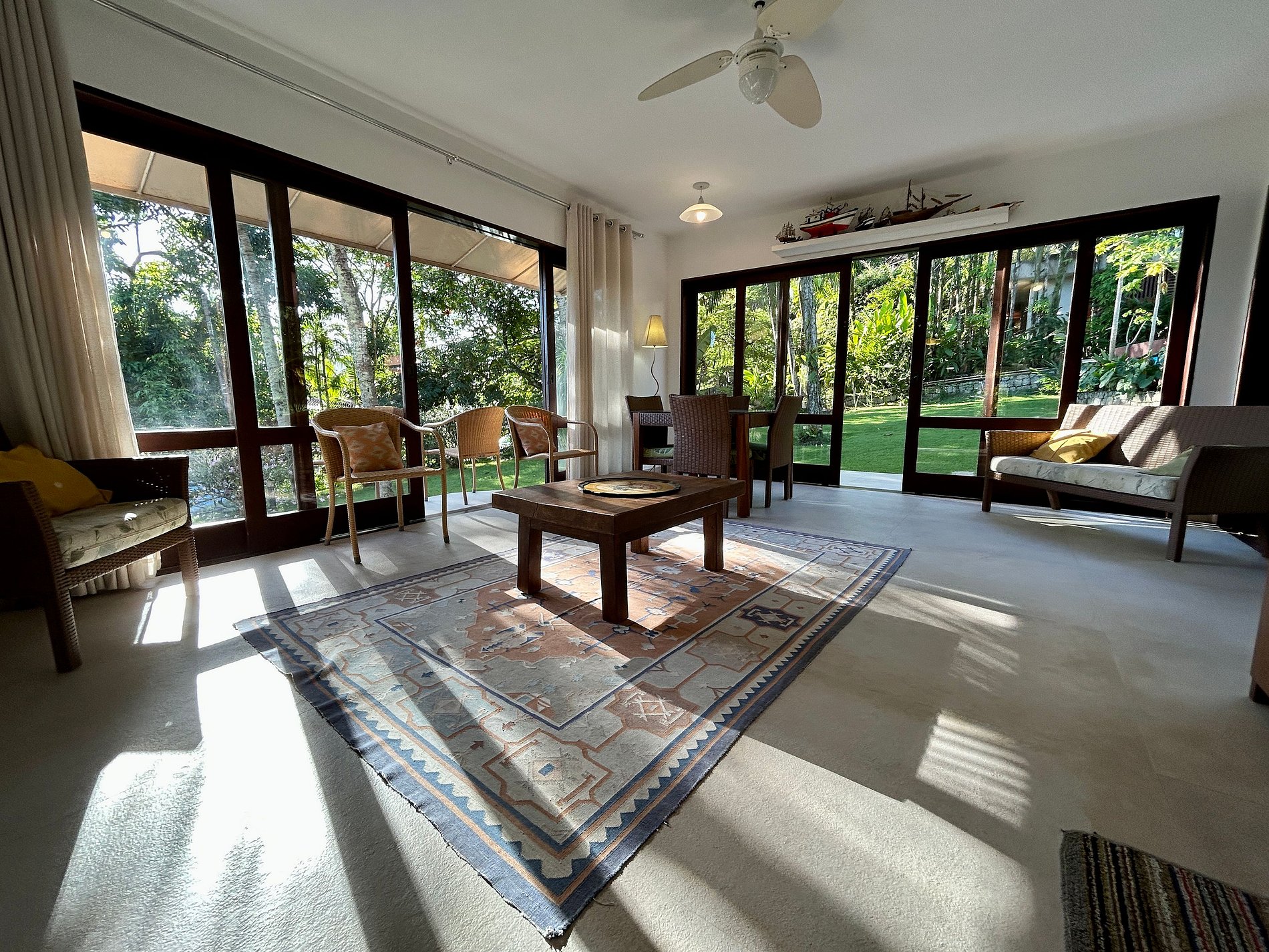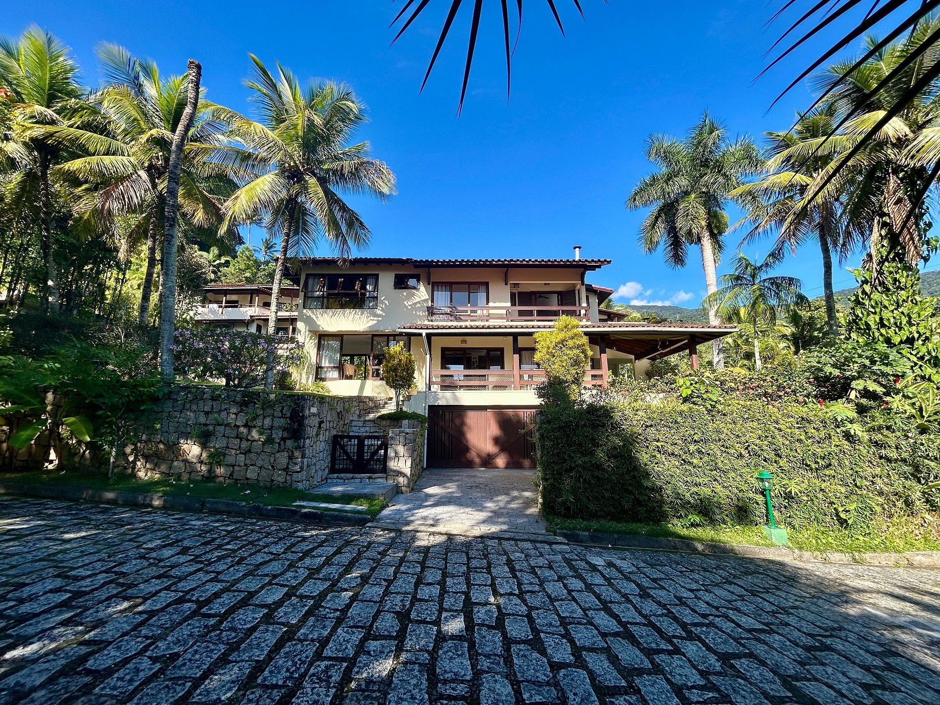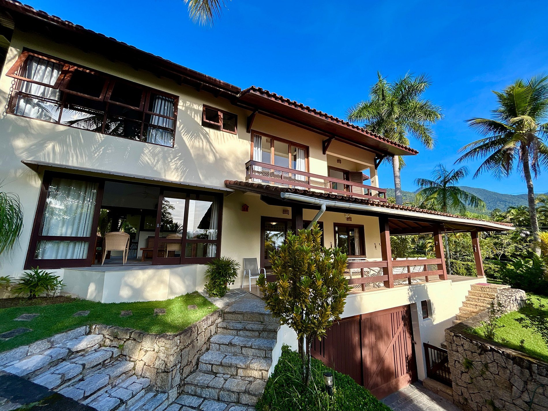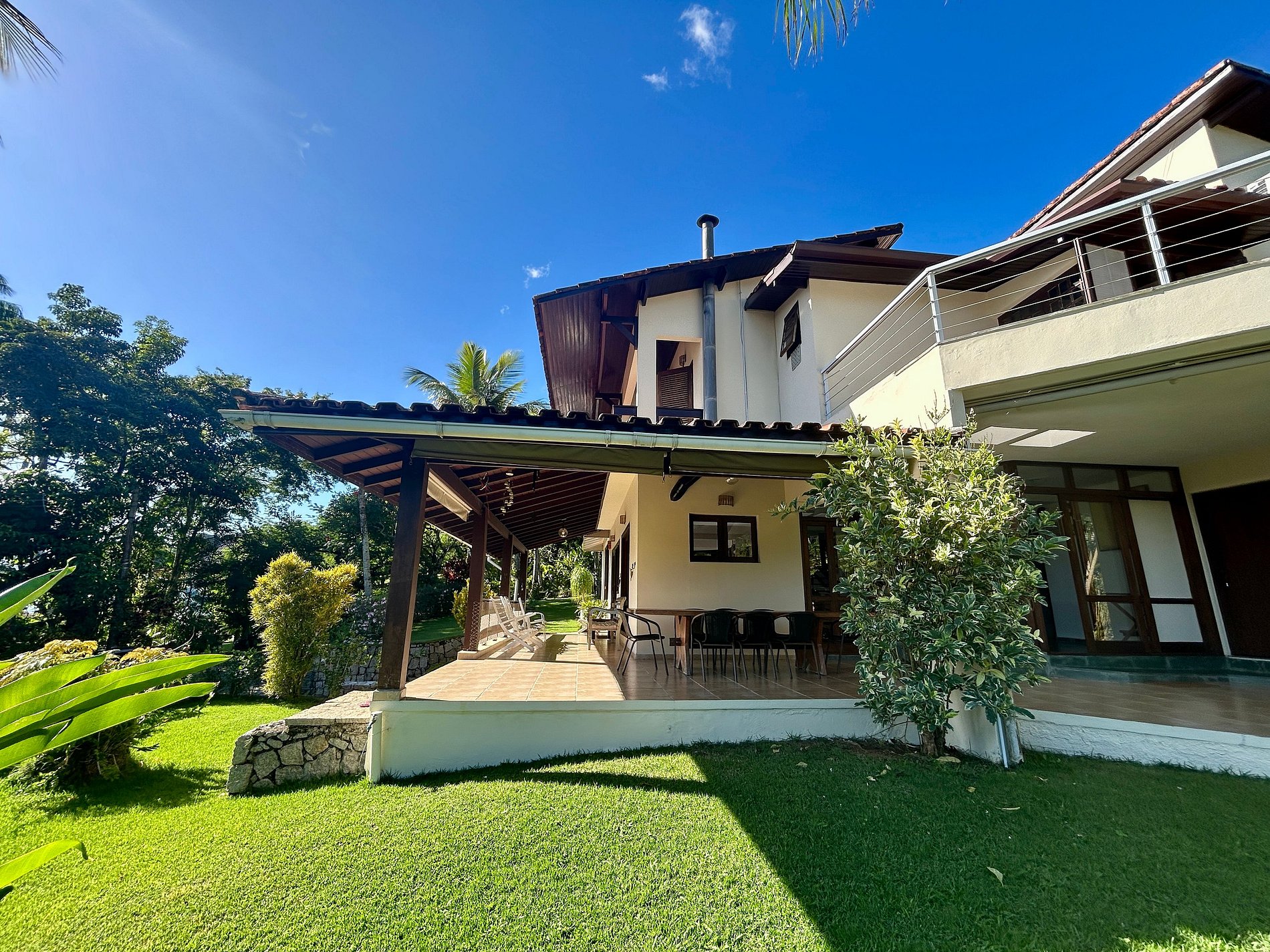 Uma das experiências mais acolhedoras de Ilhabela. Casa confortável e ampla, no São Mathias, condomínio pé na areia, na Feiticeira, Sul de Ilhabela, a 40m da praia. Vista mar e montanha. Ideal para 12 pessoas. São 5 suítes, todas com ar-condicionado e 1 quarto de serviço. Salas de estar, jantar, lareira, cozinha e varanda integradas. Smart TV, canais a cabo e Wi-fi. Área externa deliciosa, com piscina, churrasqueira e belo jardim, para curtir em família. É pet friendly!