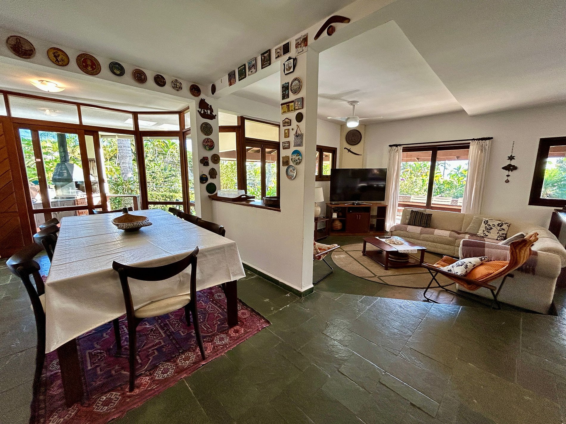 7) Animais de estimação são permitidos, pedimos por gentileza, que não os deixem subir em camas, sofás, tapetes e espreguiçadeiras; mantenham o local limpo, recolhendo fezes e fazendo uso de tapete higiênico. A casa é toda cercada. Para passeio no condomínio, sempre com coleira;