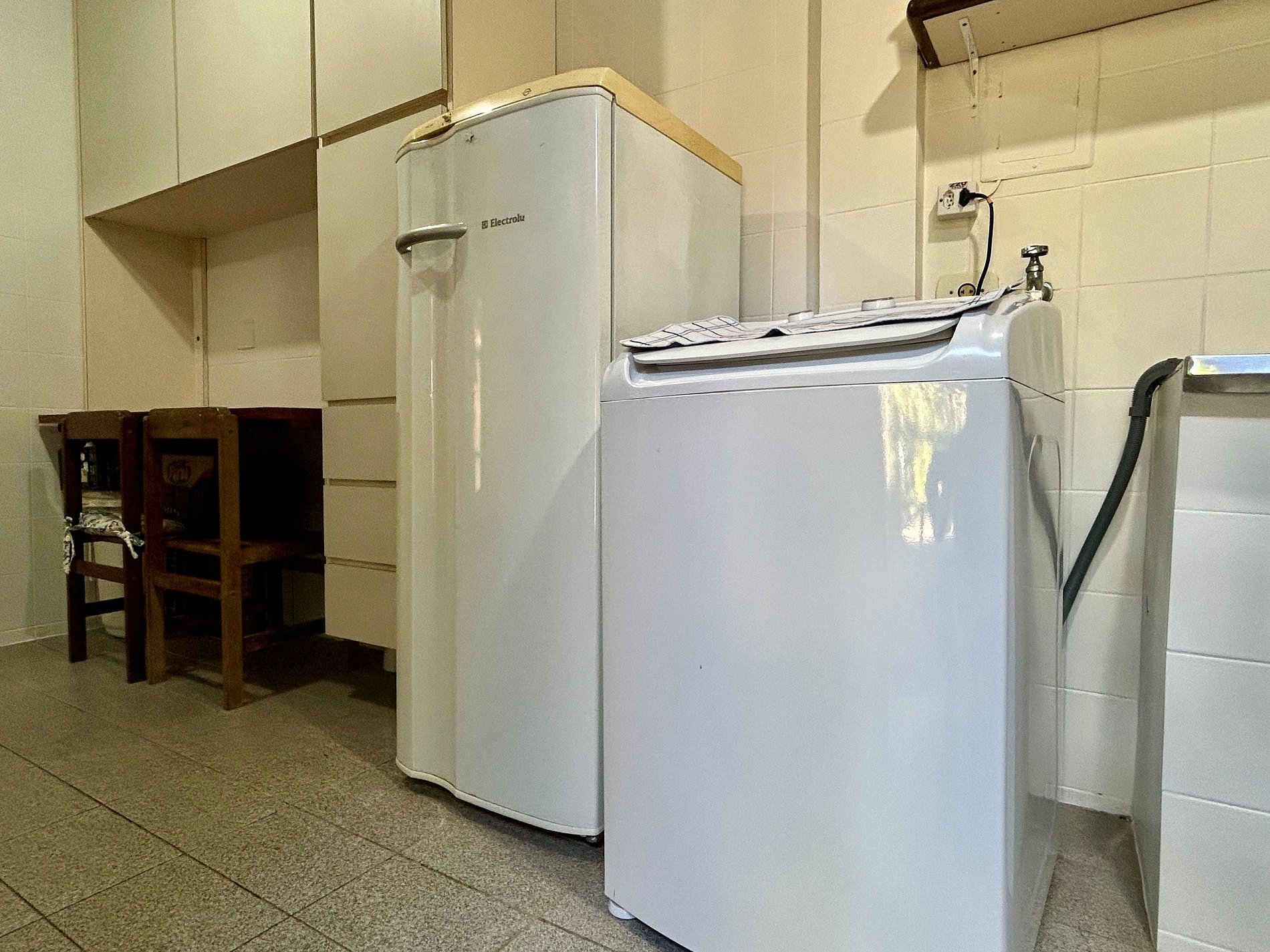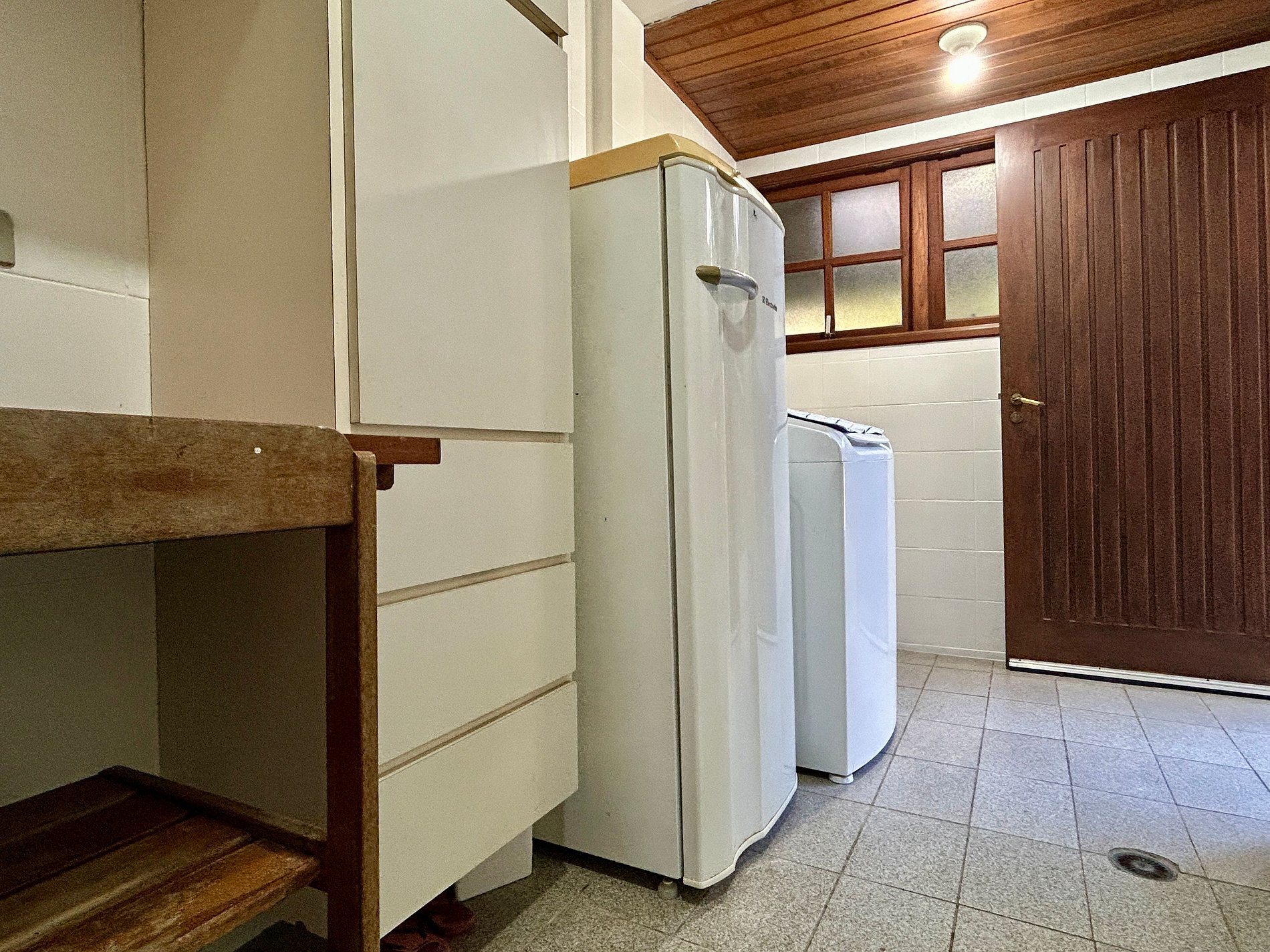 - Lavanderia com máquina de lavar, tanque e varal.