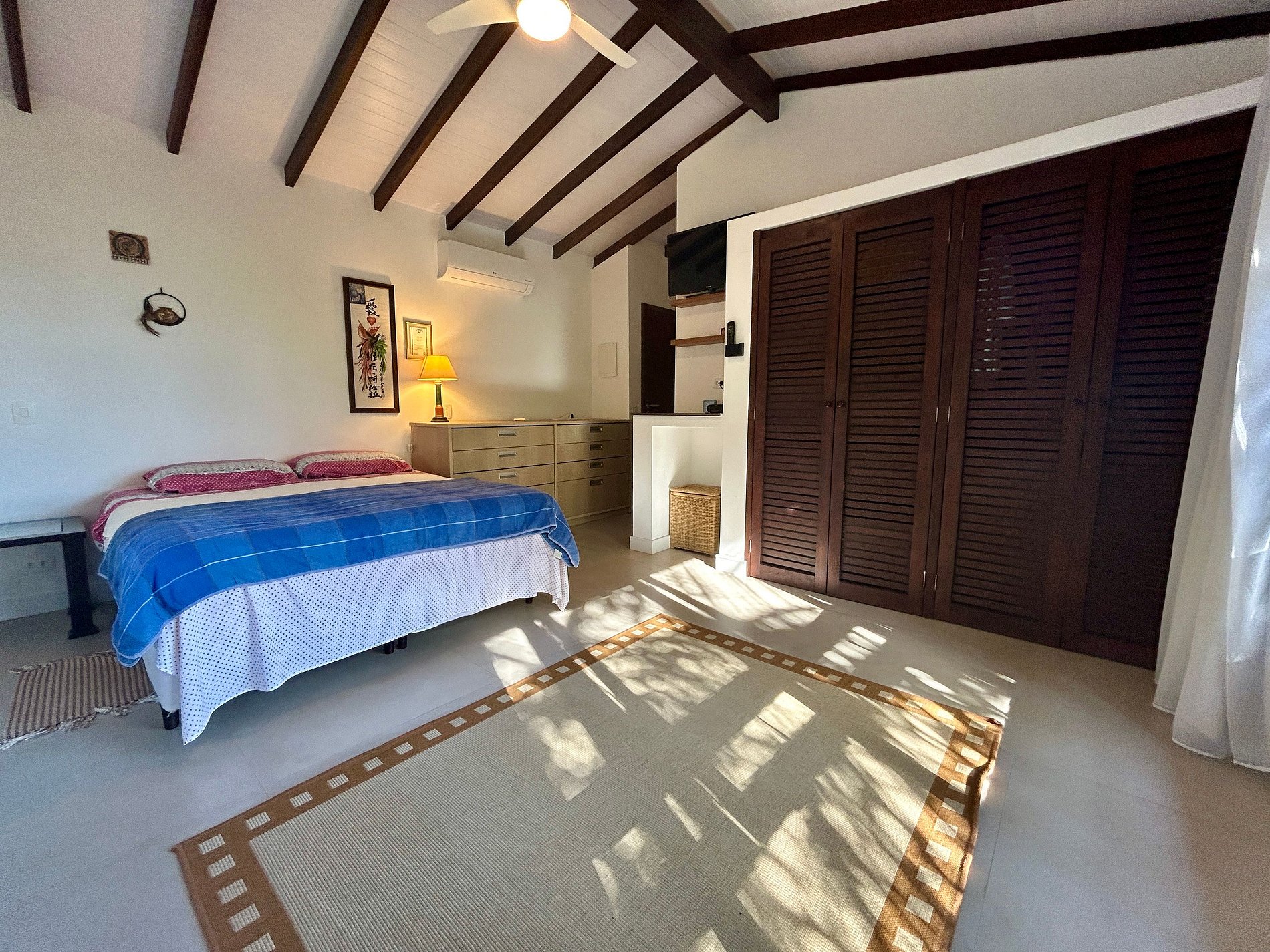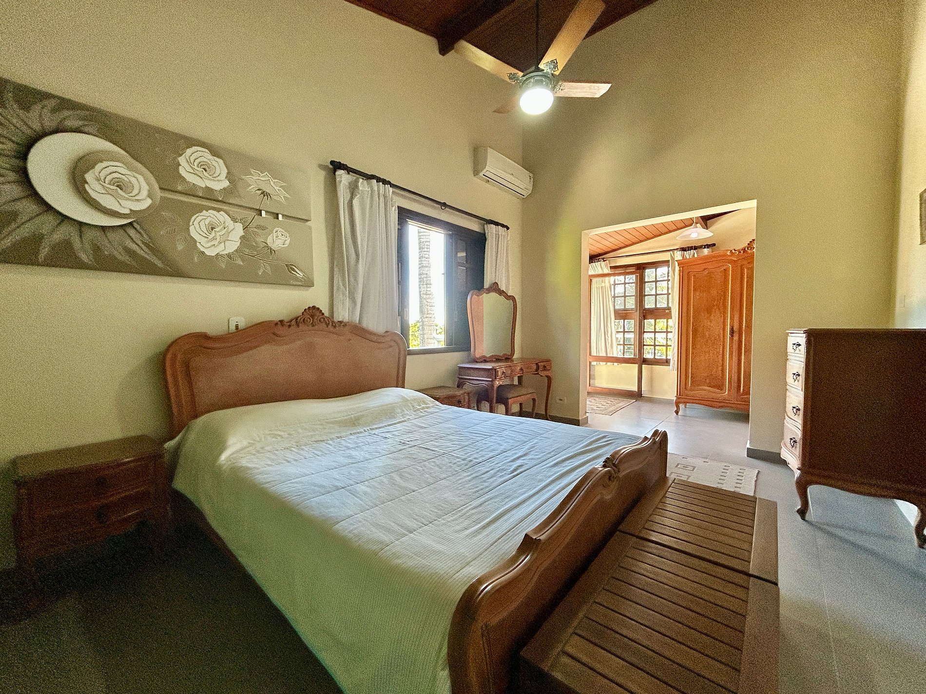 São 5 suítes, todas com ar-condicionado e enxoval completo, na seguinte configuração:
