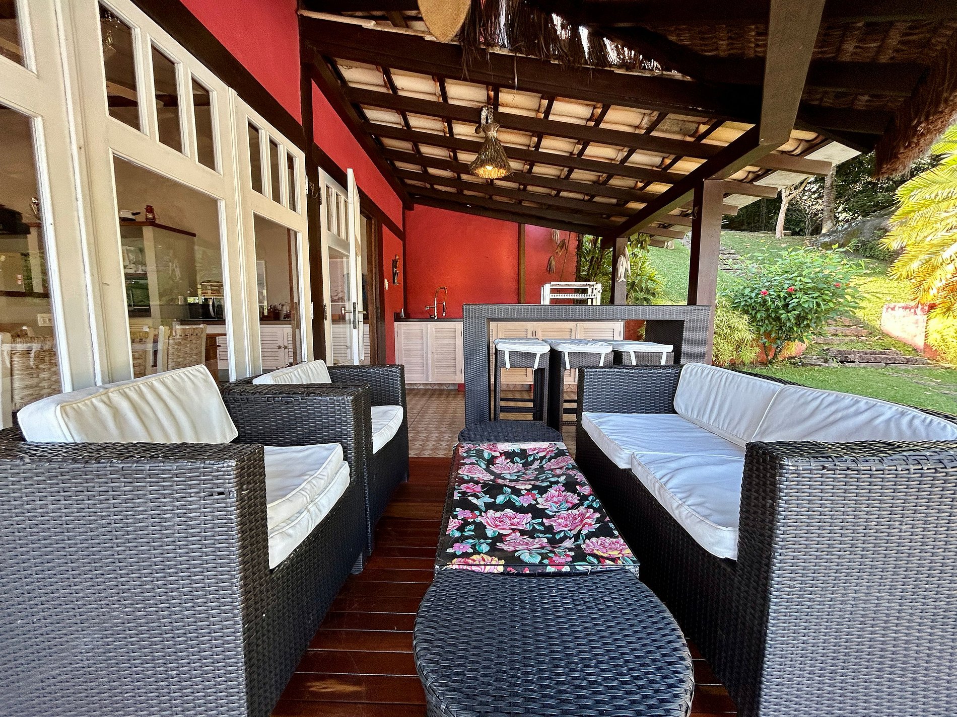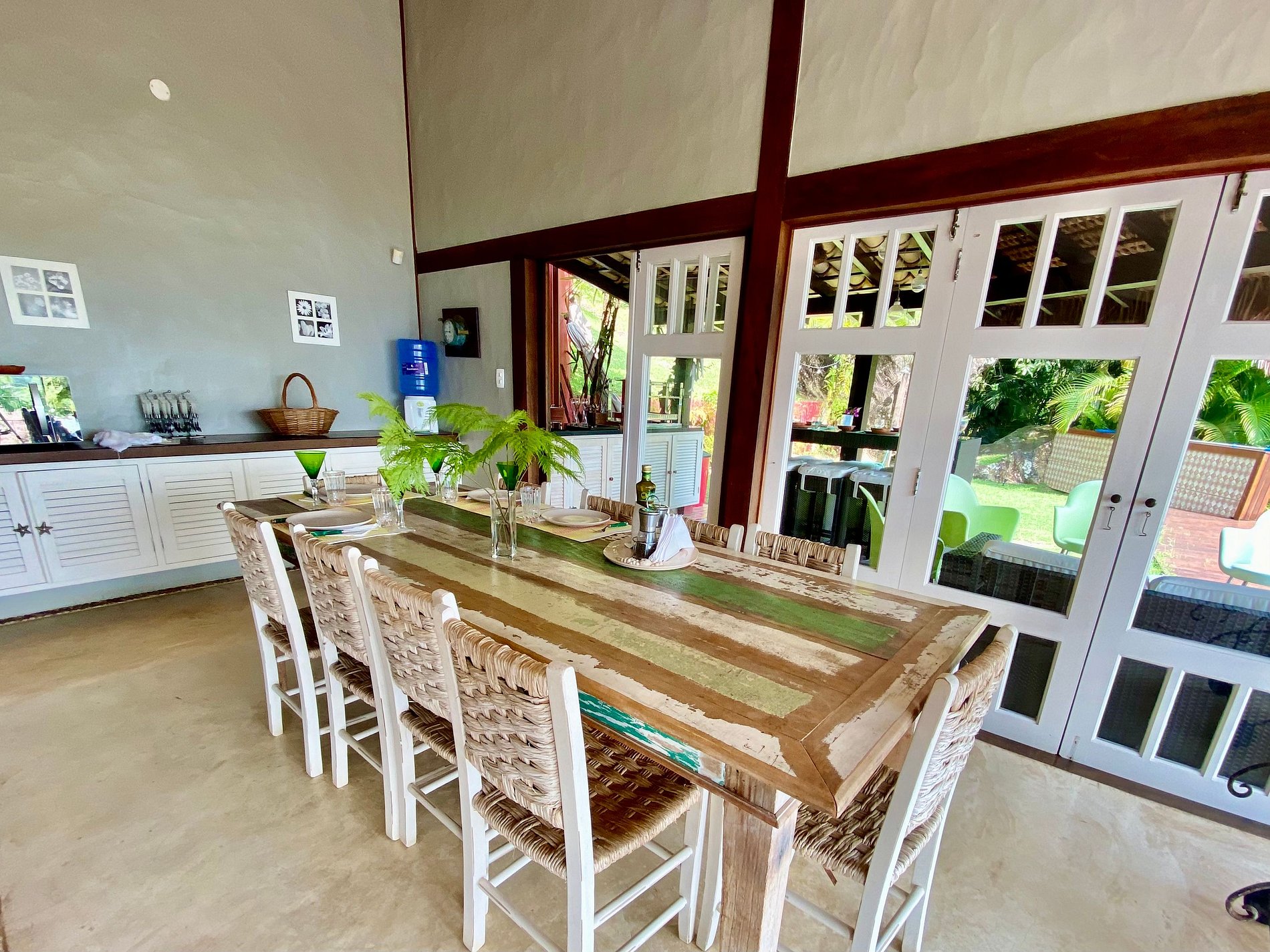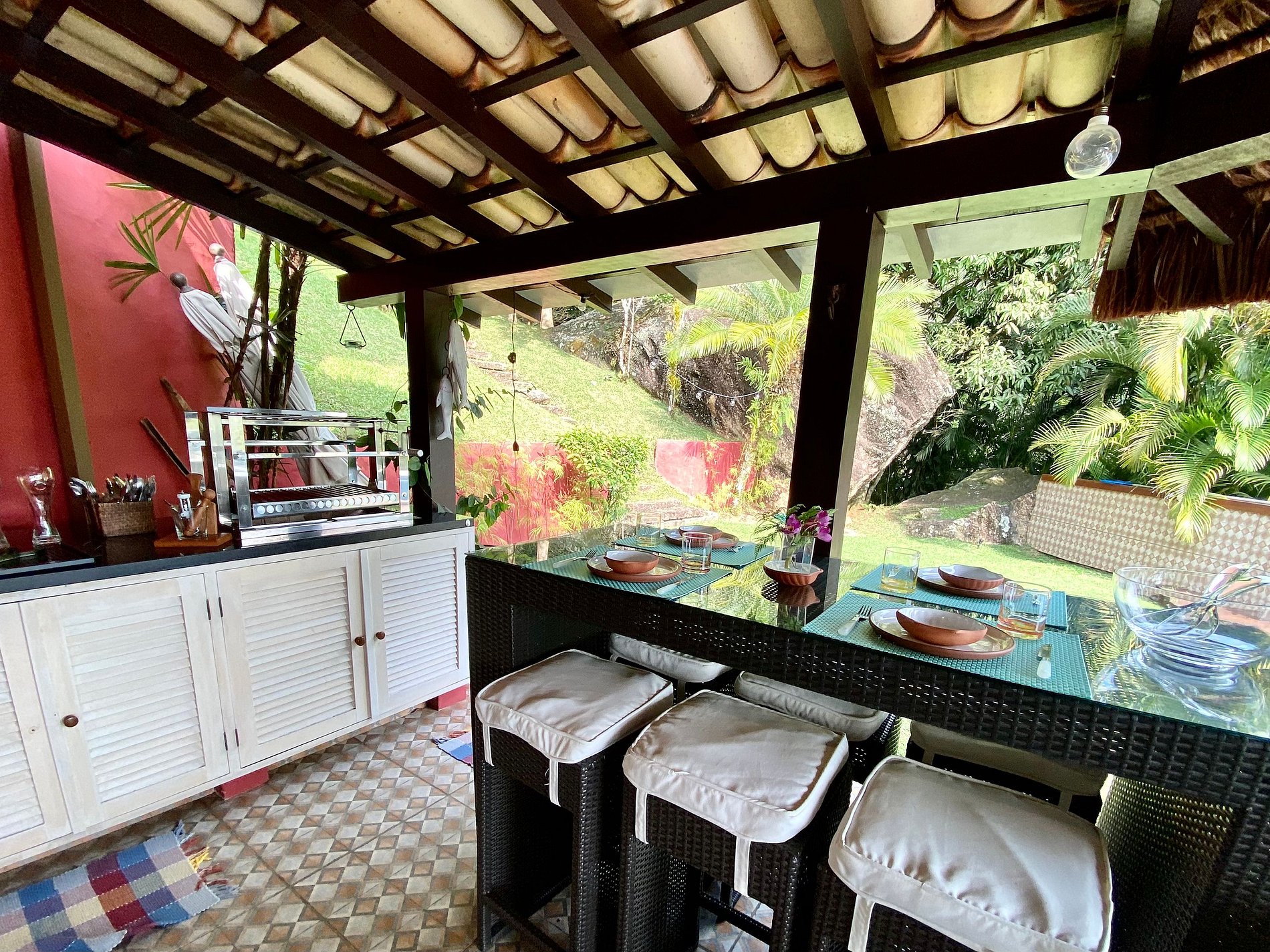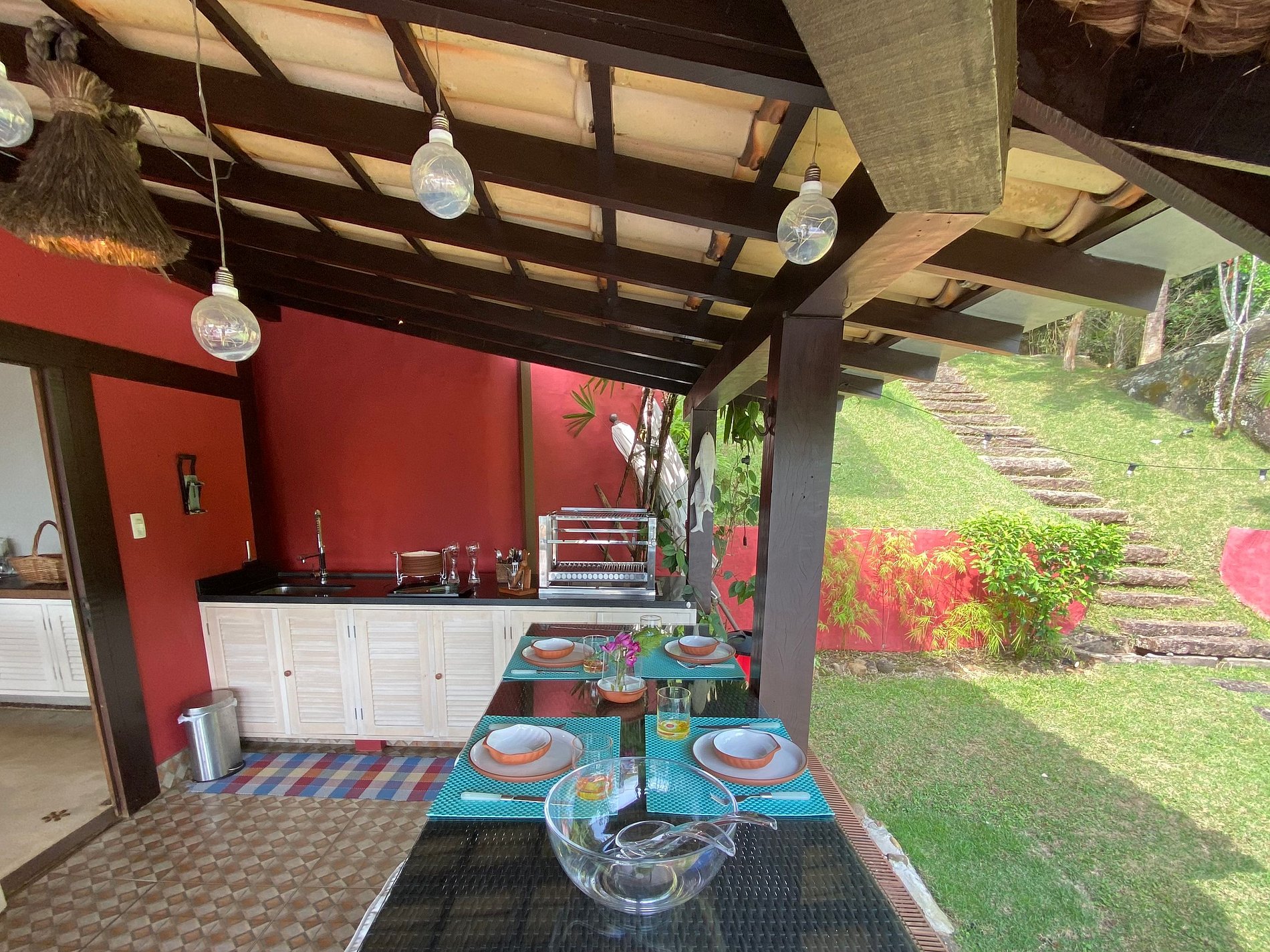 - Toda a propriedade é incrível e super bem equipada, tem tudo para uma estadia perfeita! O terreno é enorme e proporciona muito contato com a natureza. As portas das salas e cozinha com abertura para área externa, integram o espaço interno e tornam o ambiente muito arejado e iluminado.