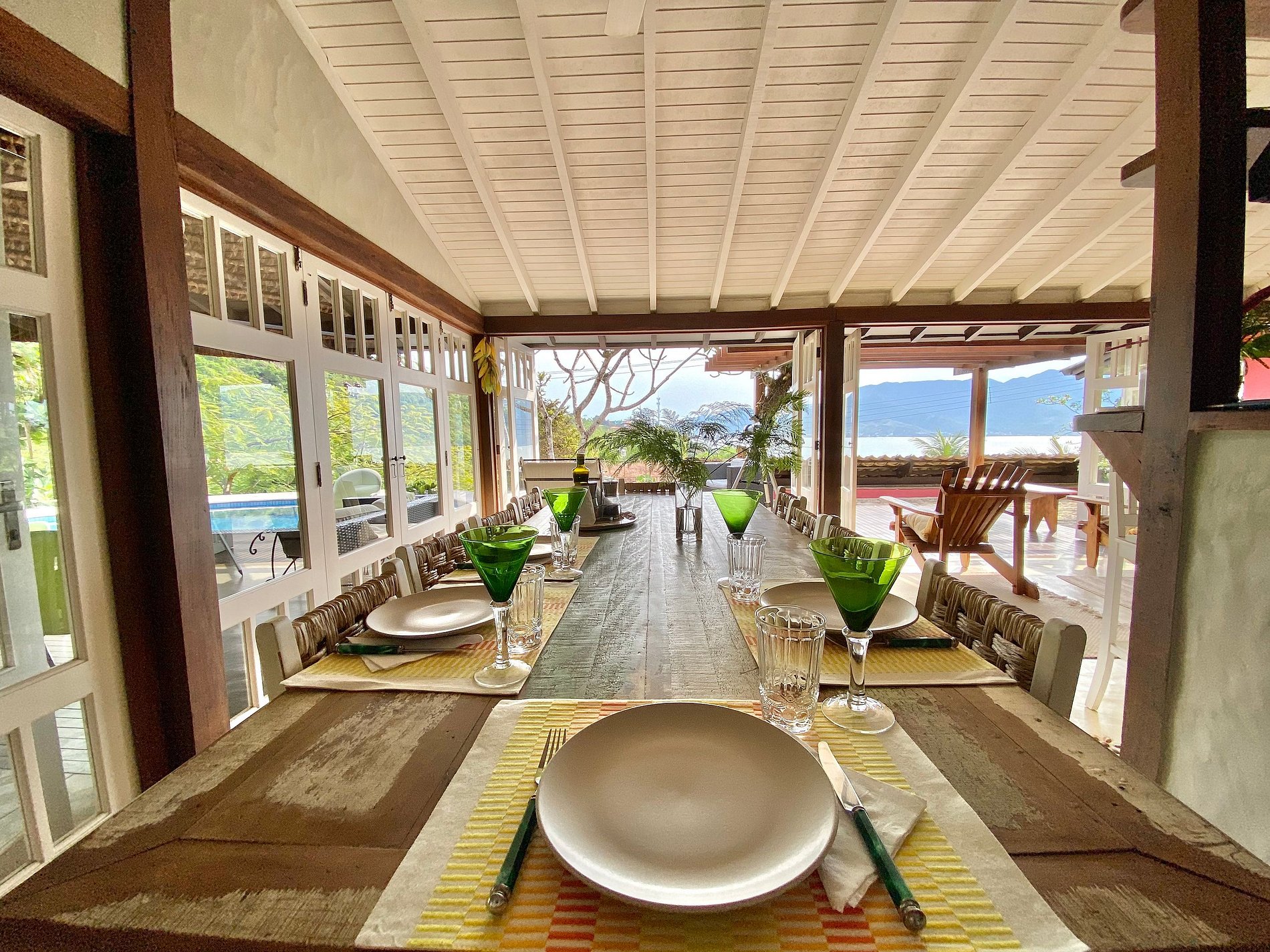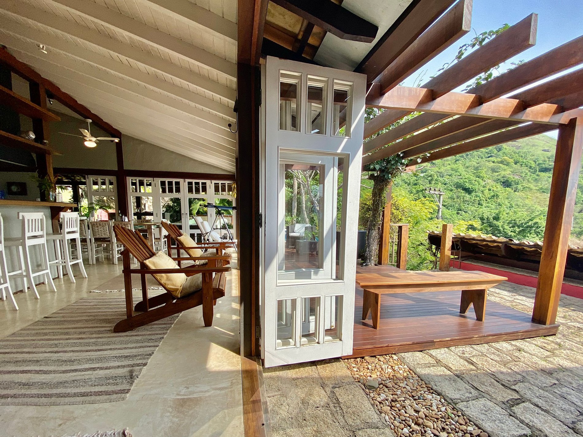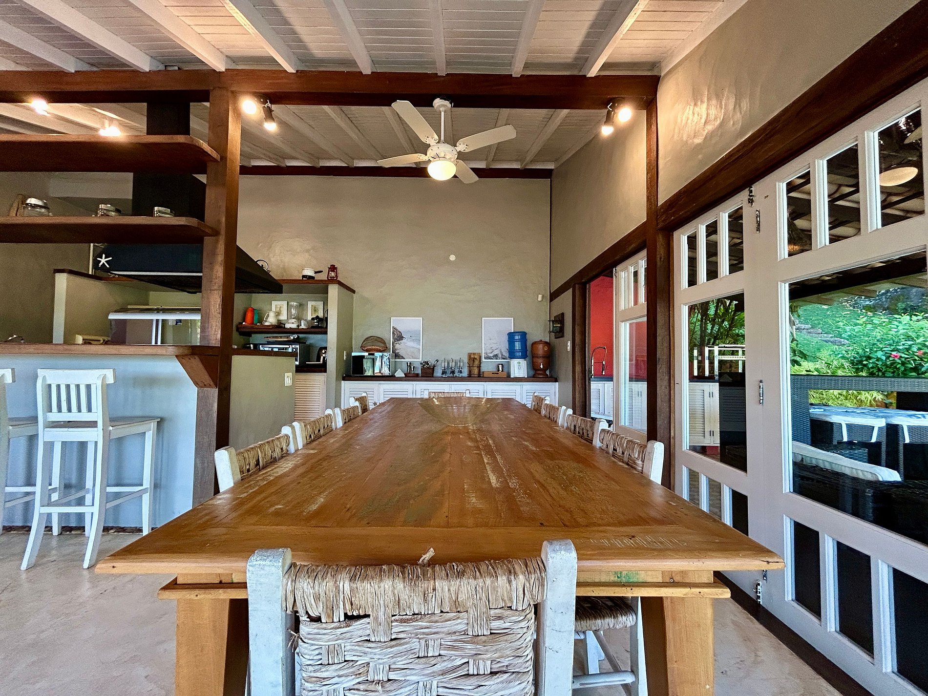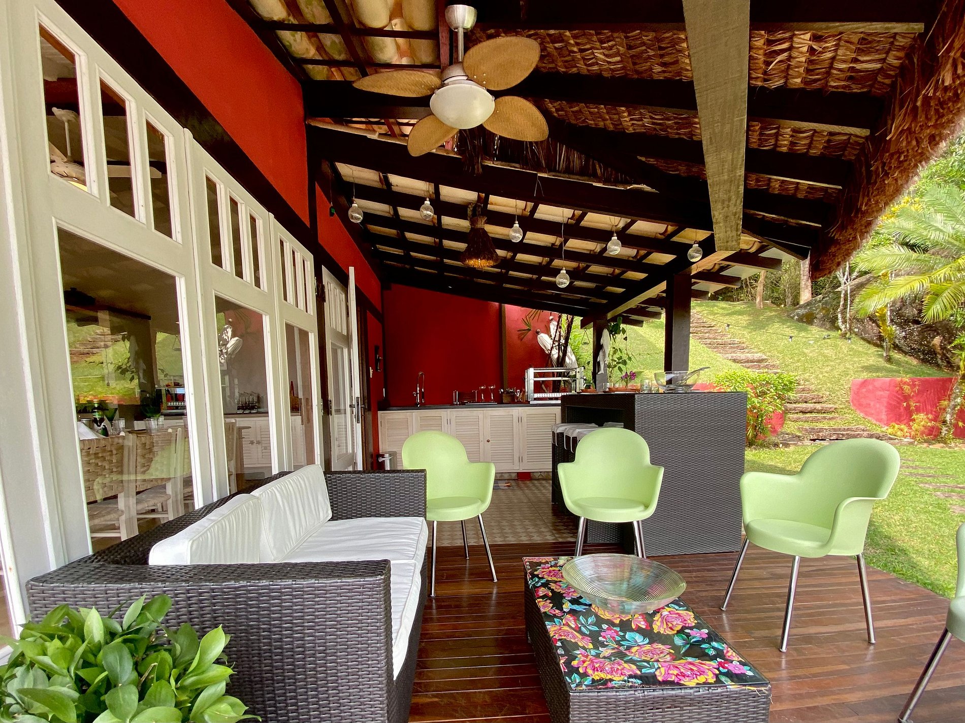 - Toda a propriedade é incrível e super bem equipada, tem tudo para uma estadia perfeita! O terreno é enorme e proporciona muito contato com a natureza. As portas das salas e cozinha com abertura para área externa, integram o espaço interno e tornam o ambiente muito arejado e iluminado.