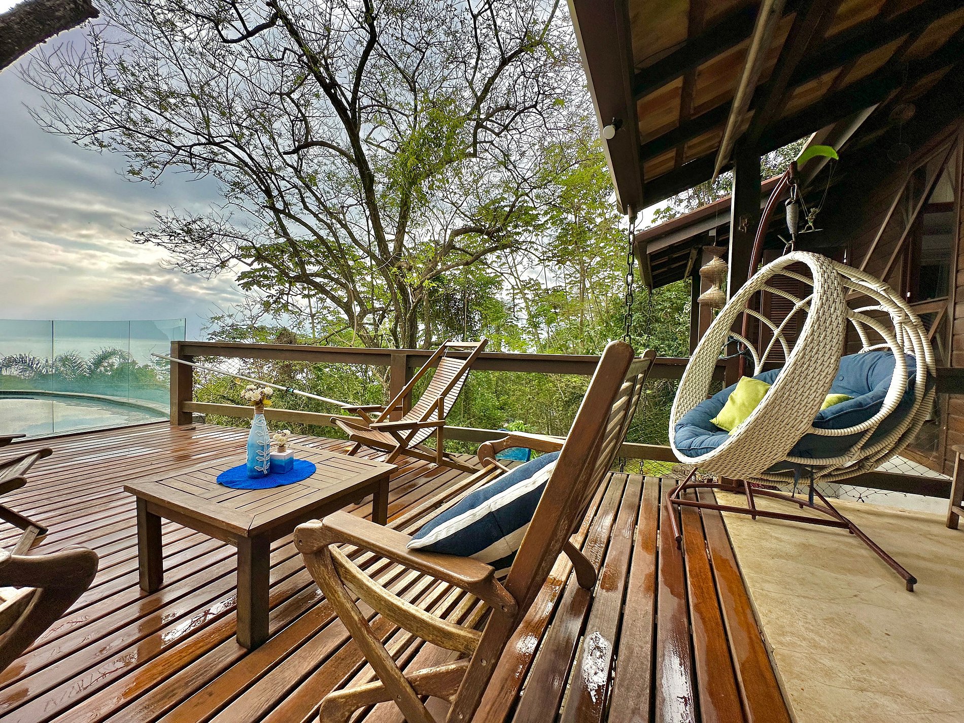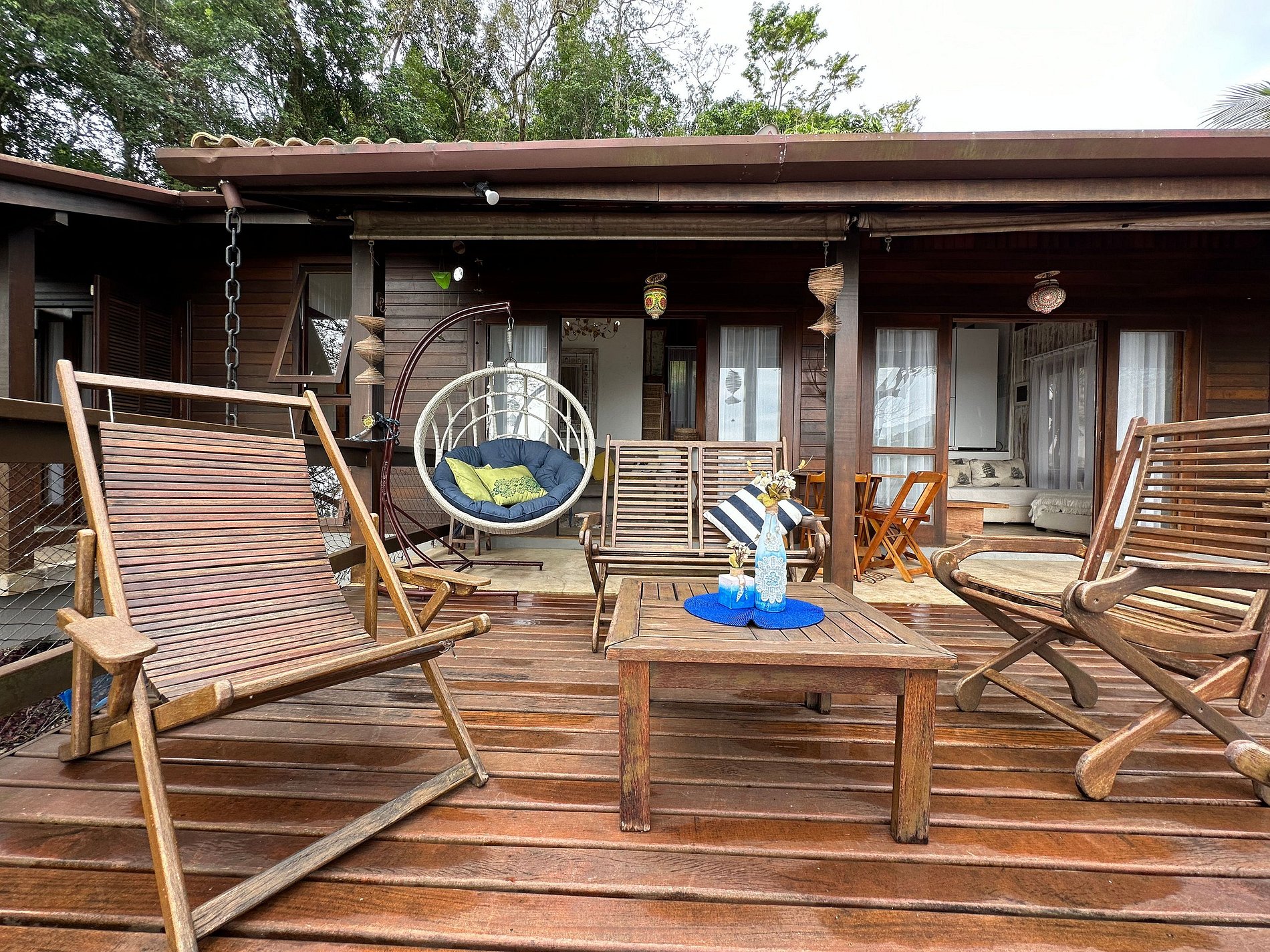 - O espaço externo proporciona um conforto em cada cantinho, conta com um deck de madeira coberto de muito verde, além de espaço com churrasqueira, sem cobertura. A piscina é um show à parte, com borda infinita, hidromassagem e uma vista deslumbrante para o mar, além de espreguiçadeiras que trazem muito conforto;