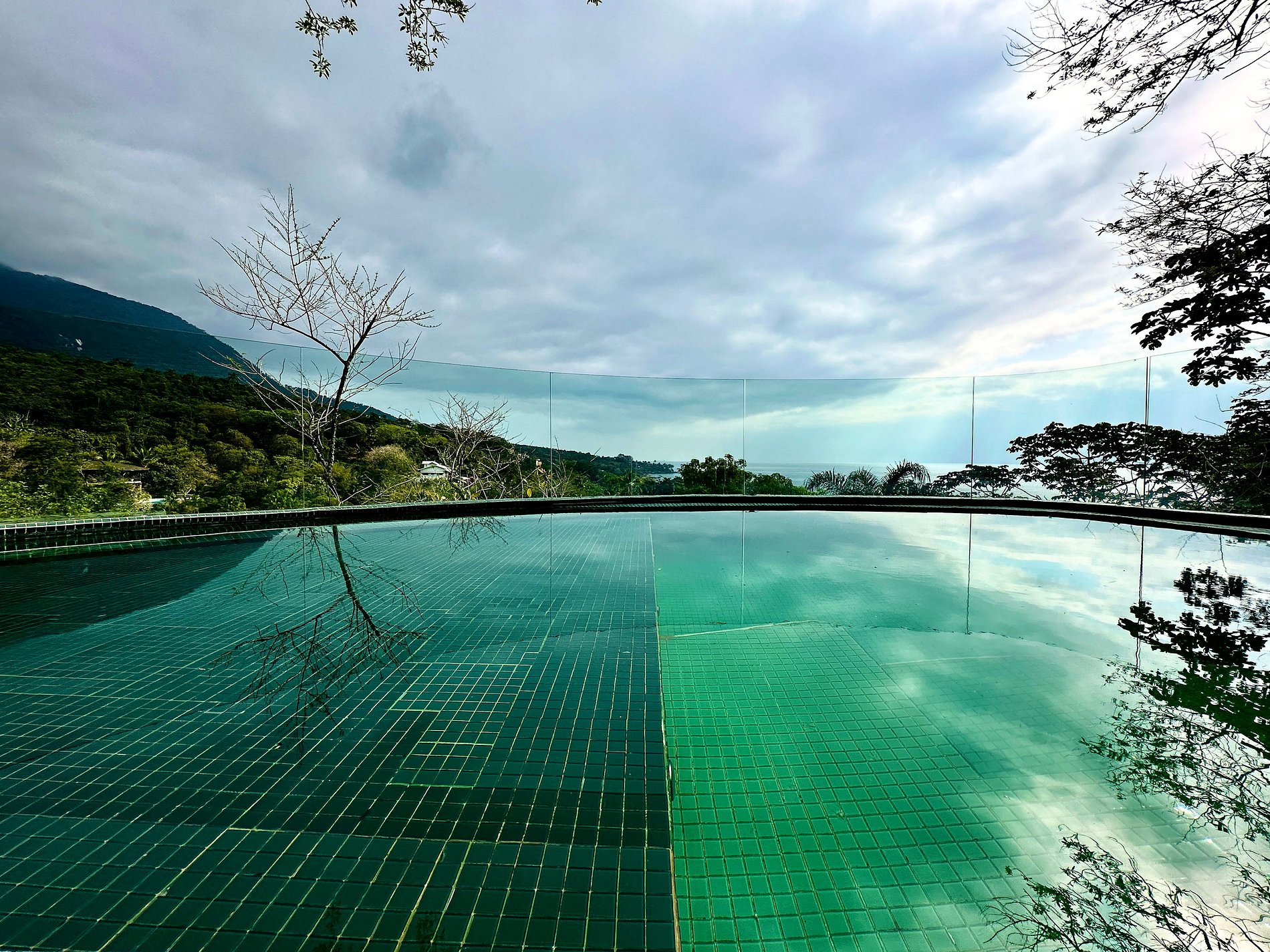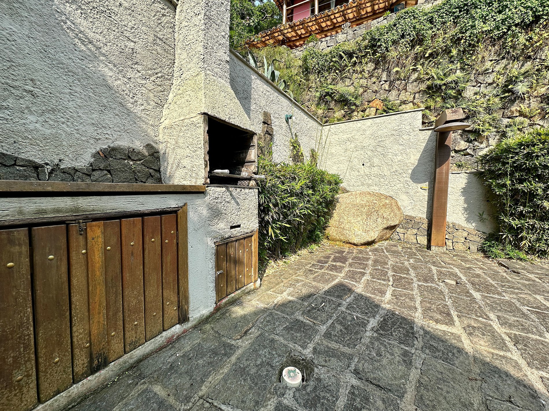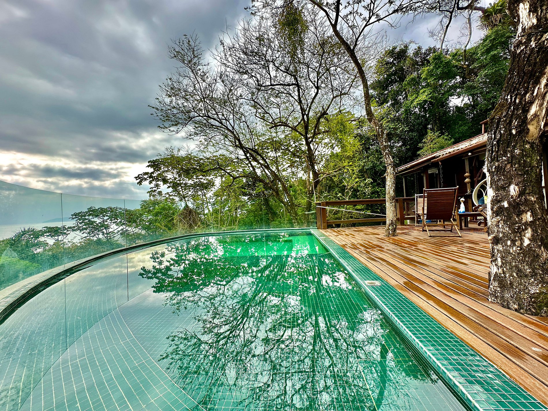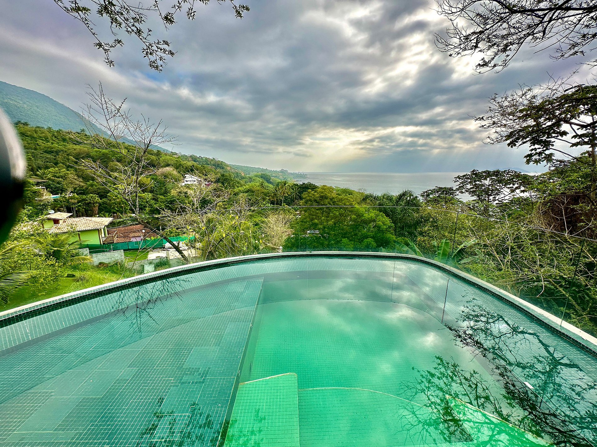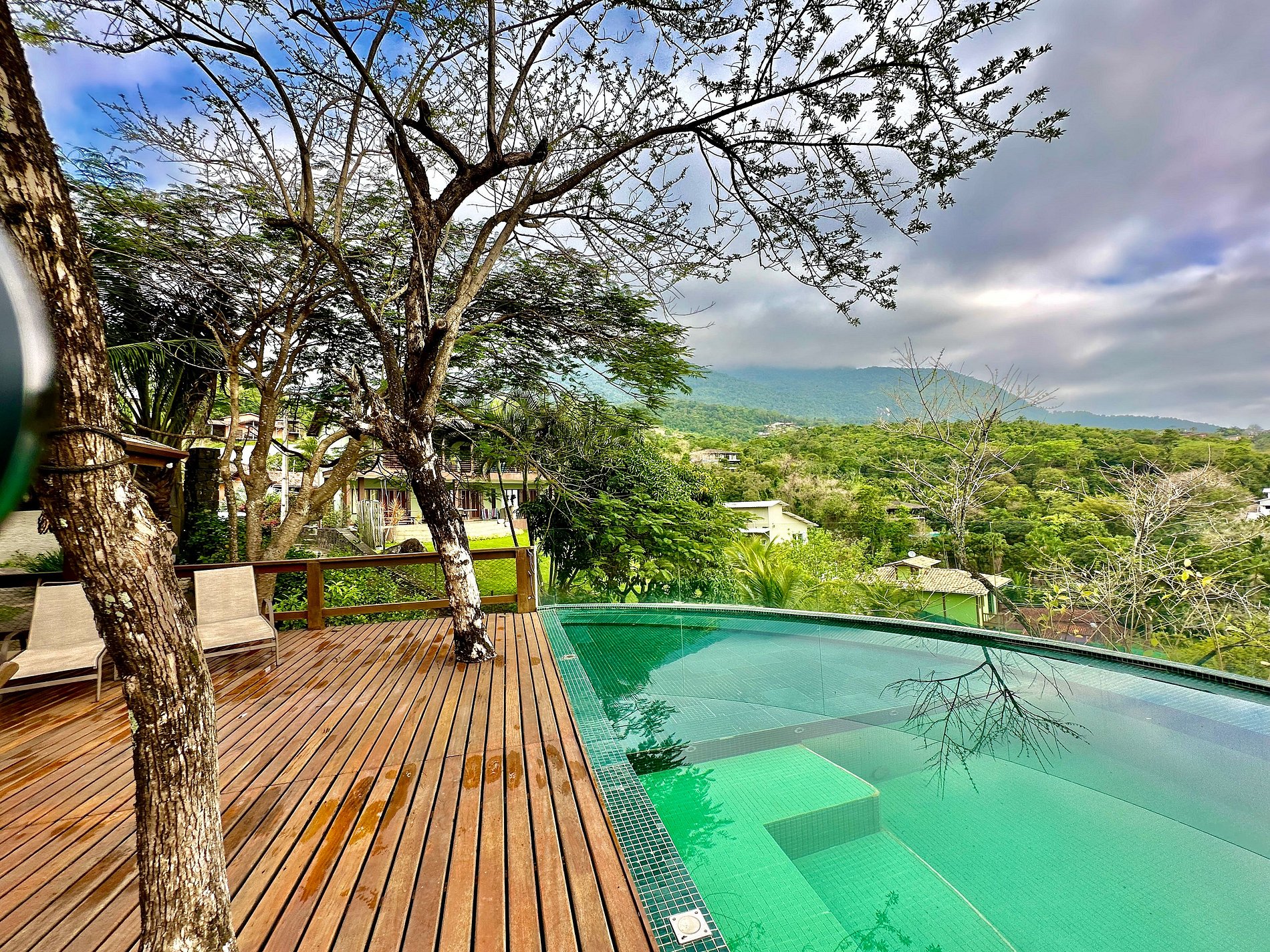 - O espaço externo proporciona um conforto em cada cantinho, conta com um deck de madeira coberto de muito verde, além de espaço com churrasqueira, sem cobertura. A piscina é um show à parte, com borda infinita, hidromassagem e uma vista deslumbrante para o mar, além de espreguiçadeiras que trazem muito conforto;