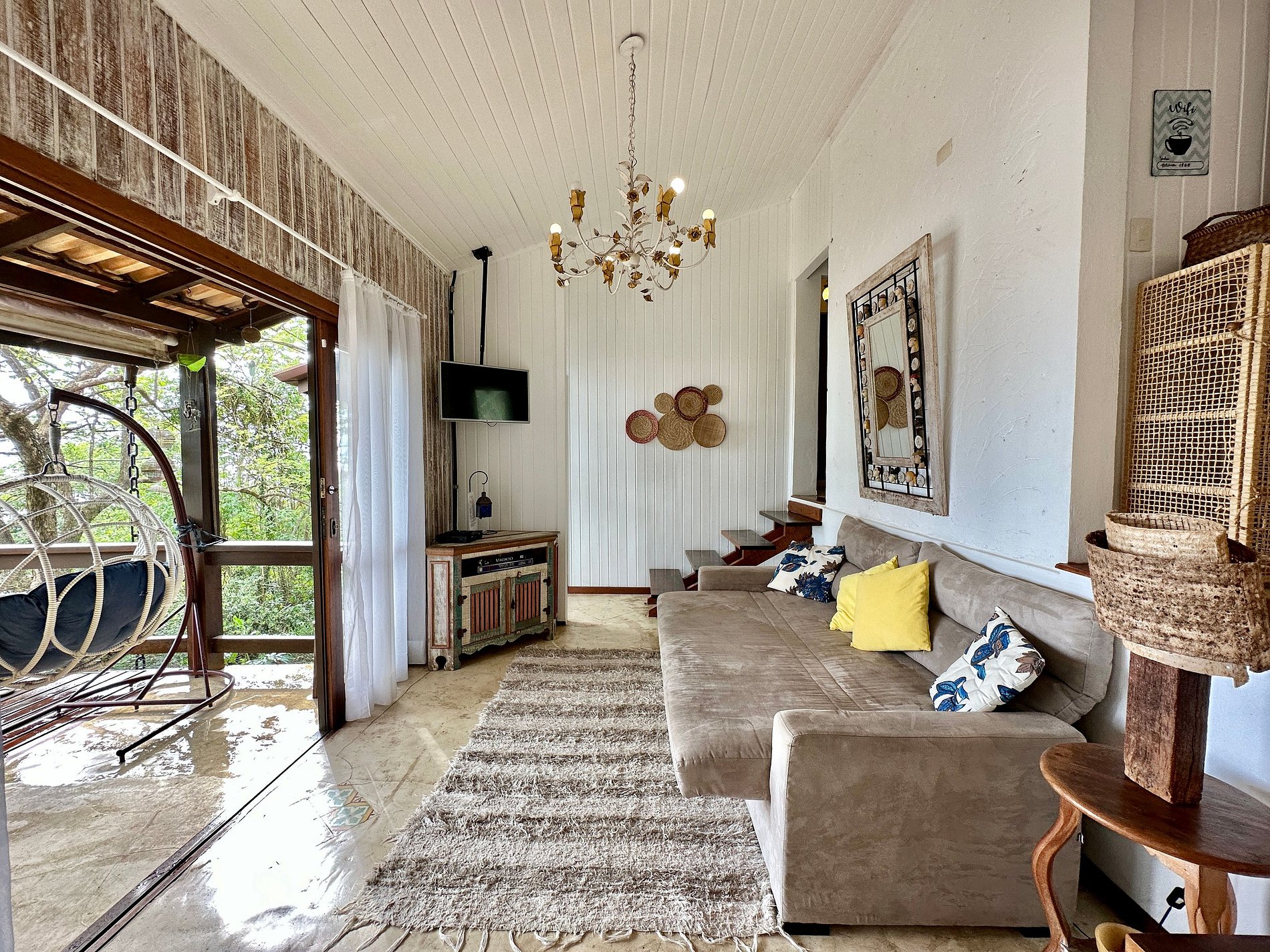 - Ambiente interno com lavabo, sala ampla e arejada, com claridade natural por todo o espaço, decoração rústica, sofás confortáveis e uma sala de TV para noites de filme e conforto;