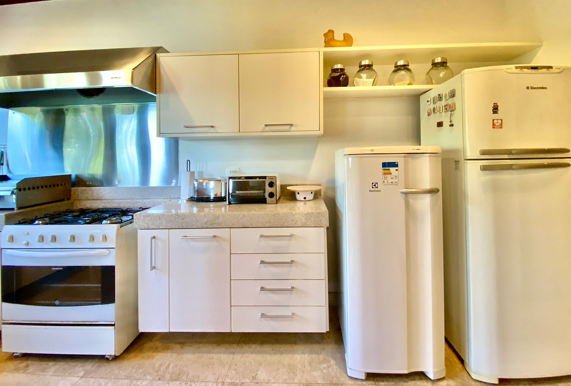- Possui uma cozinha completa com fogão de cinco bocas, micro-ondas, forno elétrico, liquidificador, geladeira, freezer e chapa à gás. Na lavanderia, para sua comodidade, tem uma máquina de lavar roupa e varal;