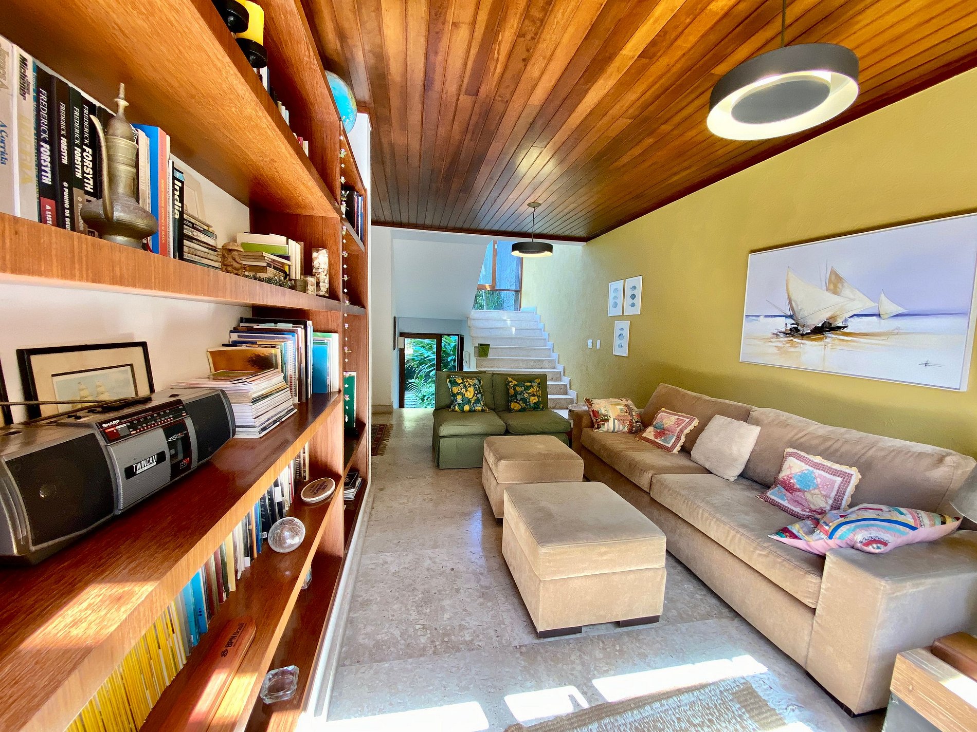 - Área de estar com vários ambientes, sendo um deles com lareira. Pé direito duplo e vigas de madeira no teto. Uma porta balcão nos leva à uma varanda coberta e com vista para o mar, muito bem decorada com sofás e mesa de jantar. Há também um jardim interno com paredes de pedra, que se integra totalmente à arquitetura da casa;