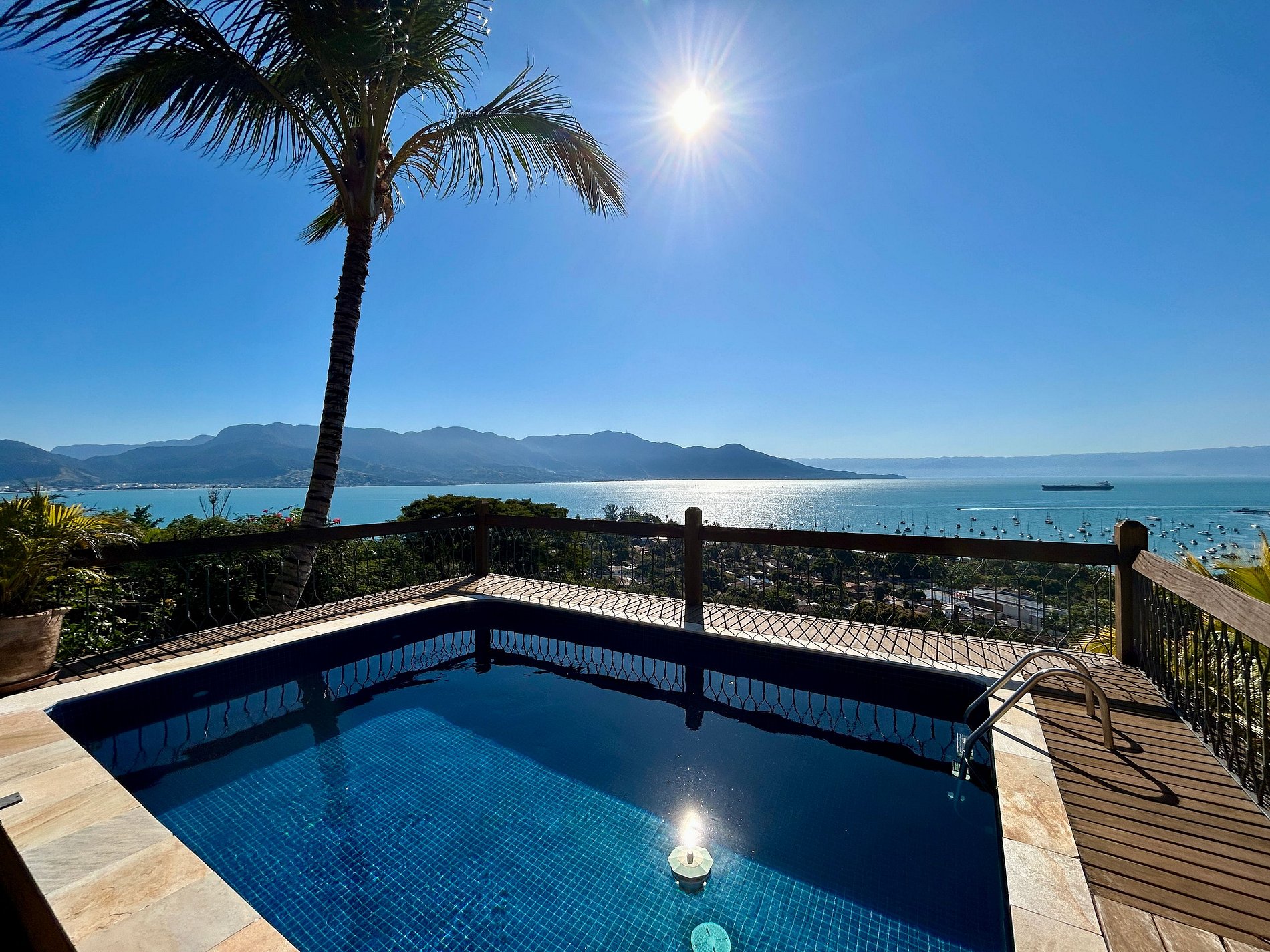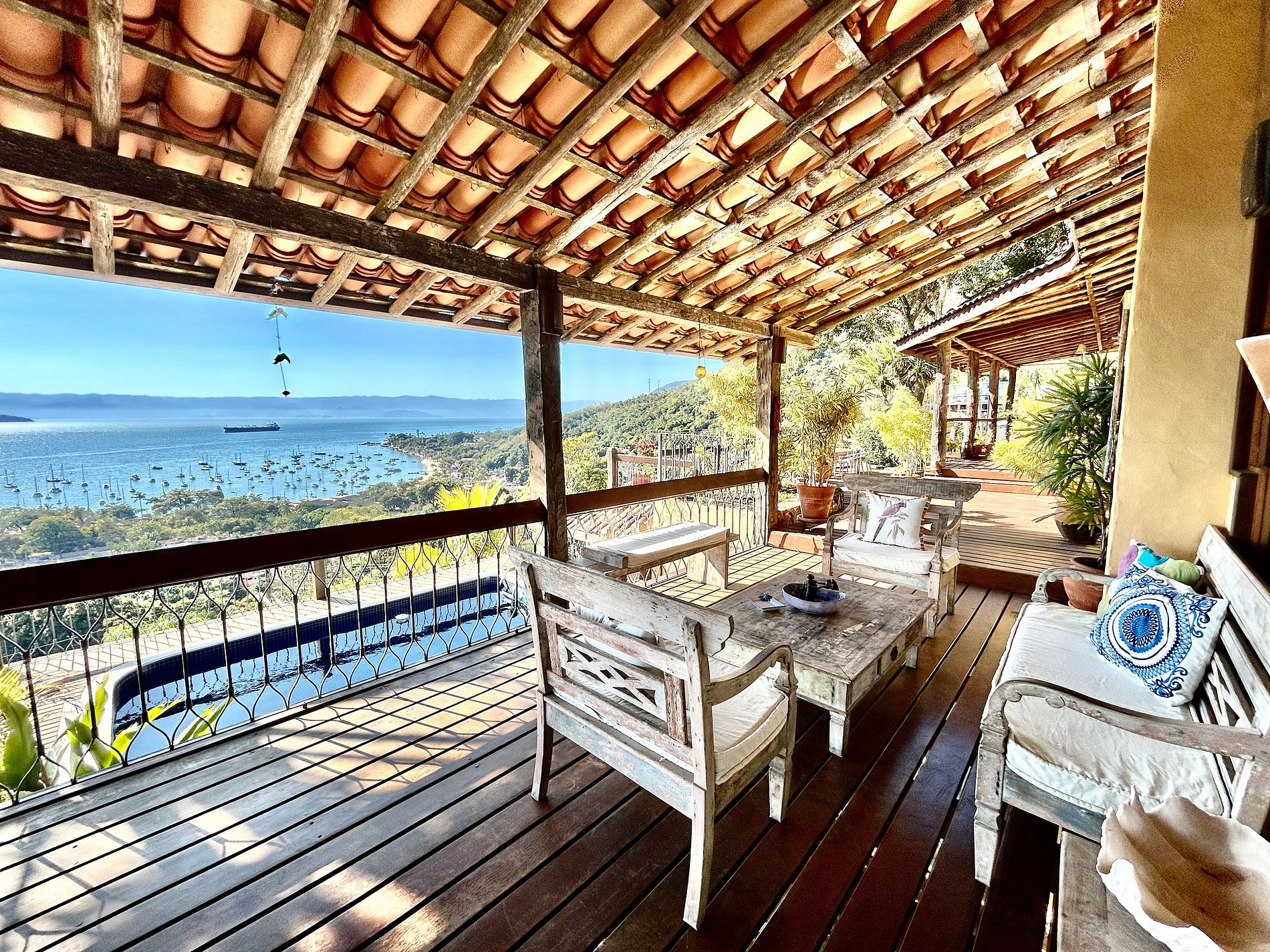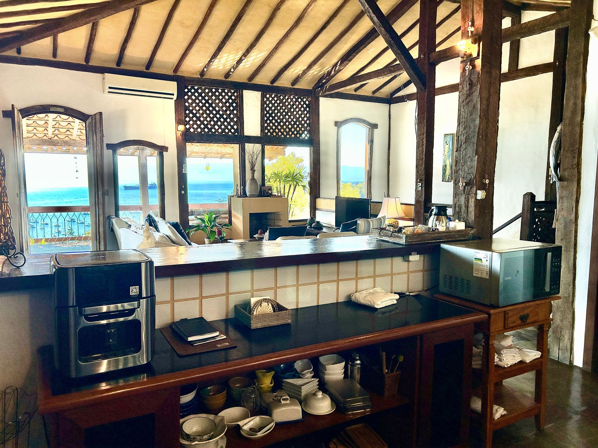 - O ambiente interno concentra a sala de estar climatizada, TV com canais a cabo, lareira, banheiro e cozinha completa e está integrado à varanda gourmet com churrasqueira, mesa para refeições e um balcão, com uma vista deslumbrante para mar e montanha;